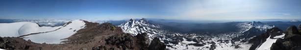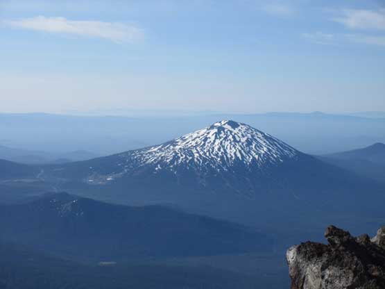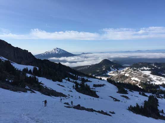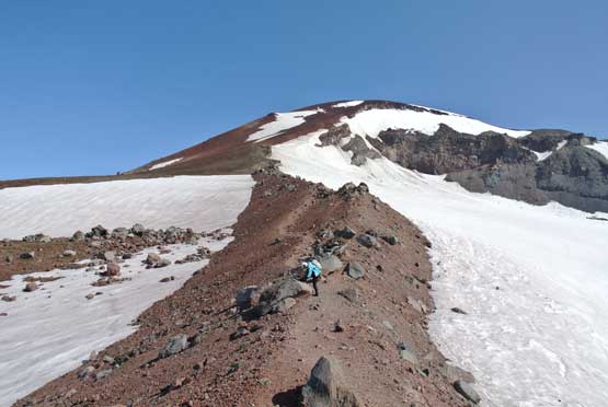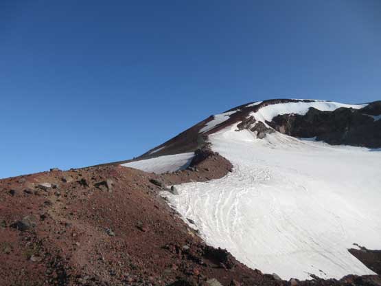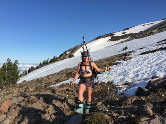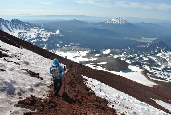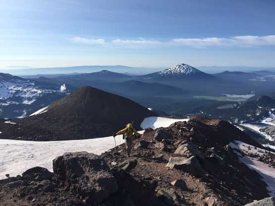 In order to get back to Vancouver in a reasonable time we opted to wake up at 5 am in the morning. In just over half an hour we had finished the entire morning routine and started the plod. I wore trail-runners and carried nothing but microspikes as technical gears. There were about 300 m of grunt right off the bat to a plateau that offered great views of the route ahead, as well as Mt. Bachelor behind. We took the first break about halfway across this plateau applying sunscreen, etc. The trail then became indistinct at places but the route was generally easy to follow. We also started to encounter continuous snow but the footpath was clear. The longest stretch of snow came when the route ascended climber’s left (west) side of a prominent rib feature. The snow was hard in the shade but I still managed to hike up the 30-degree slopes without donning microspikes.