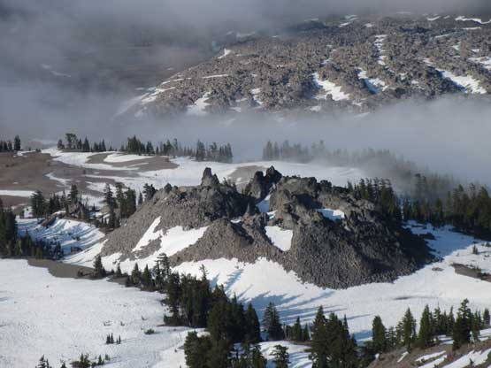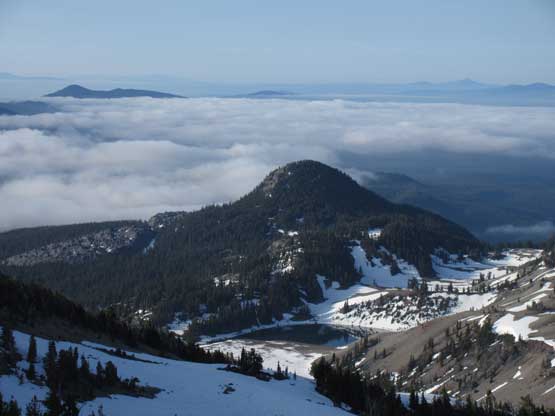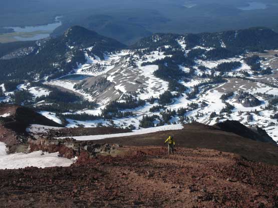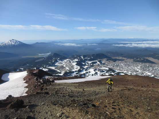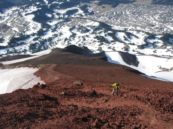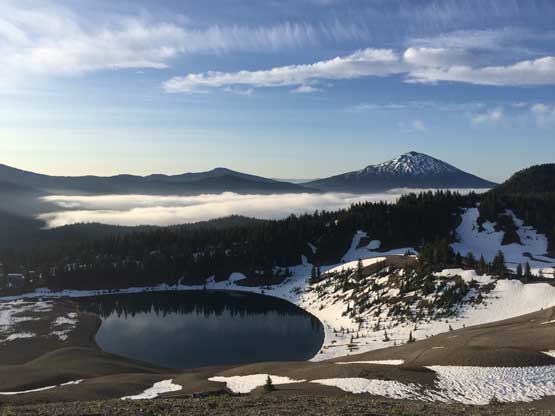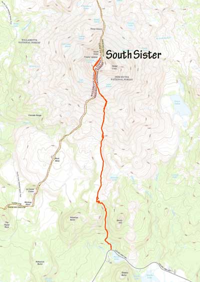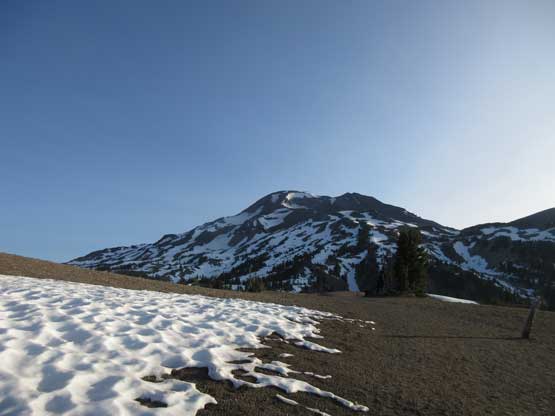 South Sister is the highest of the Three Sisters volcanoes in central Oregon and also the easiest among the three. The standard south side route is nothing but a class 1 plod on a trail/path or snow in early season and can be done easily in half a day by fit parties. Too bad the access road to Devil’s Lake trail-head isn’t plowed in winter as otherwise this would also be a classic ski mountaineering ascent. Alex and I had ascended the more-difficult North Sister and Middle Sister in 11.5 hours in the previous day. The night we car-camped at South Sister trail-head.