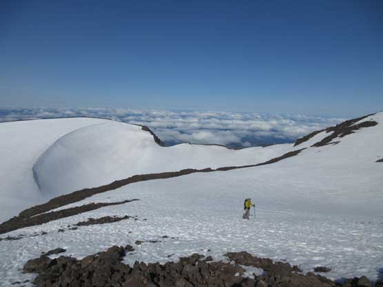 The transition onto the upper mountain was easy and by this point we had passed at least 20 hikers and skiers struggling their way up. Once the route ascended onto the uppermost south spur of the summit push the wind finally picked up, but thankfully not brutally strong. There’s a climber’s path with endless zig-zags on the south spur which significantly simplified the slog fest. Once topping out on the crater rim we easily plodded across the snowfield to the highest point on the north side of the rim, in over 3 hours after leaving the car.