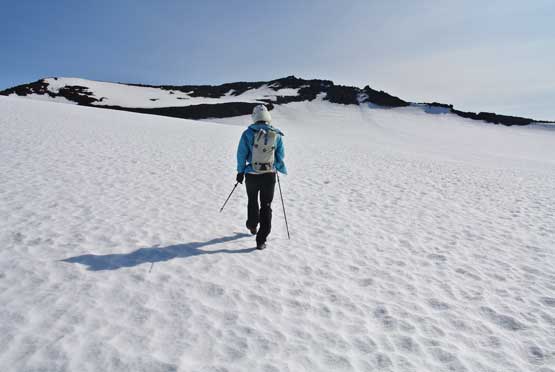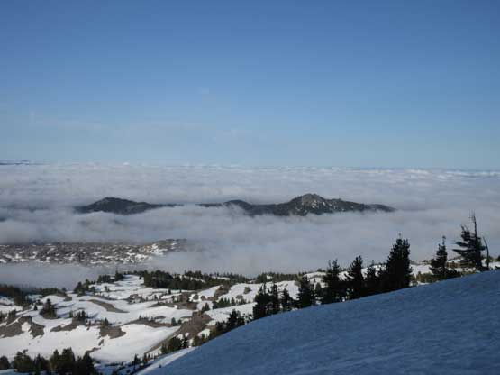 The transition onto the upper mountain was easy and by this point we had passed at least 20 hikers and skiers struggling their way up. Once the route ascended onto the uppermost south spur of the summit push the wind finally picked up, but thankfully not brutally strong. There’s a climber’s path with endless zig-zags on the south spur which significantly simplified the slog fest. Once topping out on the crater rim we easily plodded across the snowfield to the highest point on the north side of the rim, in over 3 hours after leaving the car.