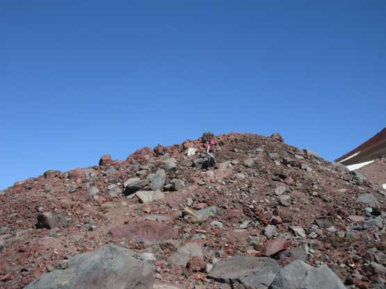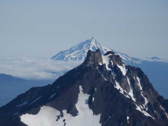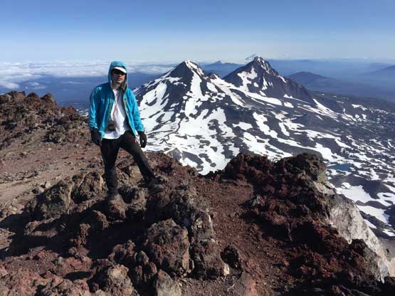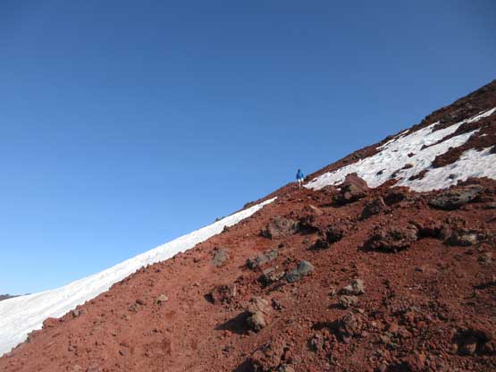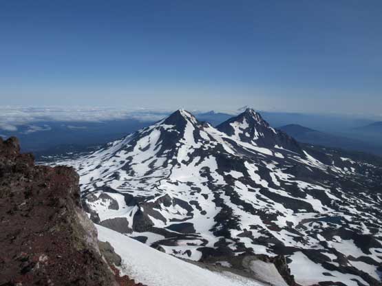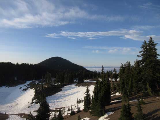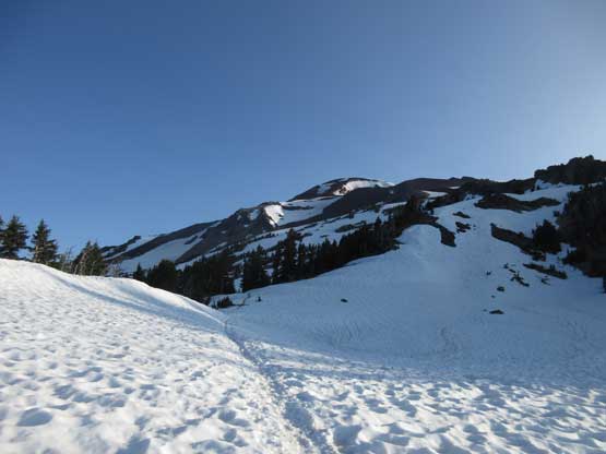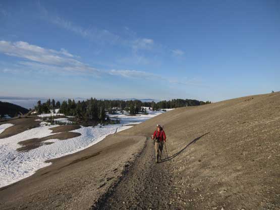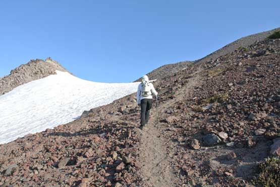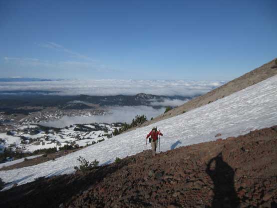 In order to get back to Vancouver in a reasonable time we opted to wake up at 5 am in the morning. In just over half an hour we had finished the entire morning routine and started the plod. I wore trail-runners and carried nothing but microspikes as technical gears. There were about 300 m of grunt right off the bat to a plateau that offered great views of the route ahead, as well as Mt. Bachelor behind. We took the first break about halfway across this plateau applying sunscreen, etc. The trail then became indistinct at places but the route was generally easy to follow. We also started to encounter continuous snow but the footpath was clear. The longest stretch of snow came when the route ascended climber’s left (west) side of a prominent rib feature. The snow was hard in the shade but I still managed to hike up the 30-degree slopes without donning microspikes.