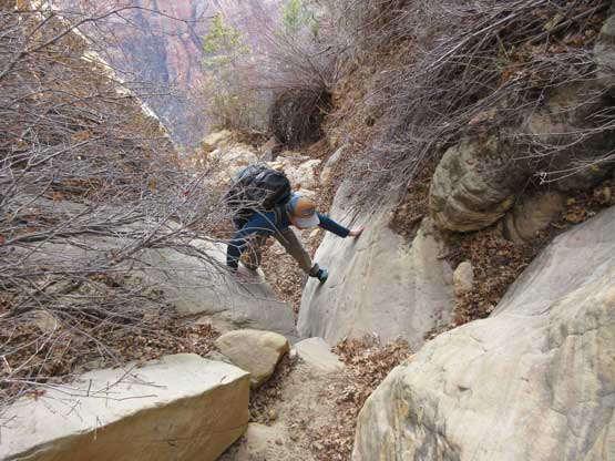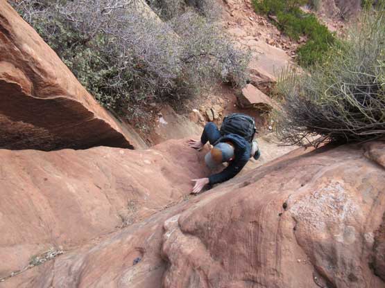Descending one of the harder steps in the “upper chutes”