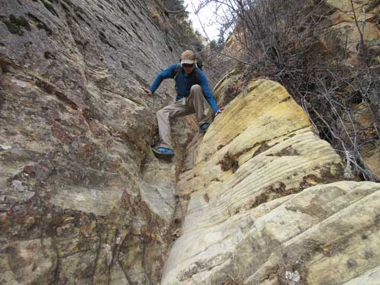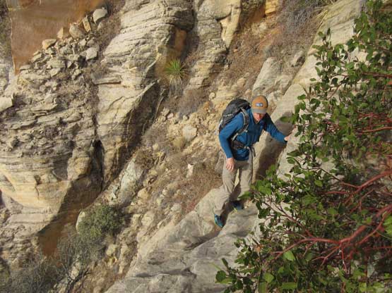 There’s one bushy and exposed step followed immediately after exiting the chimney and then the “trail” does a long horizontal traverse due south. Much of this traverse involves zero elevation change. Once at the southern end of this bench the “trail” then does a couple tight zig-zags and then there came the “dihedral crux”. The consensus is that this is the real crux of the route despite the lack of exposure. Jake volunteered to solo the pitch and then belayed the backpacks and myself up – very tricky even with rock shoes. The grade in Courtney Purcell’s book is 5.4 while most trip reports state 5.6-5.7 and because of my limited experience on sandstone slabs I’d agree with the latter.