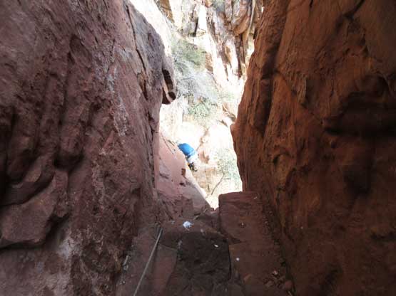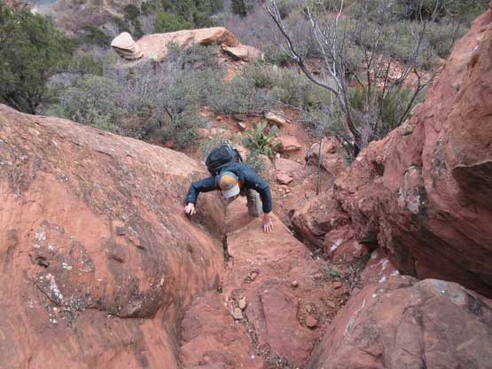 Descending one of the harder steps in the “upper chutes”
