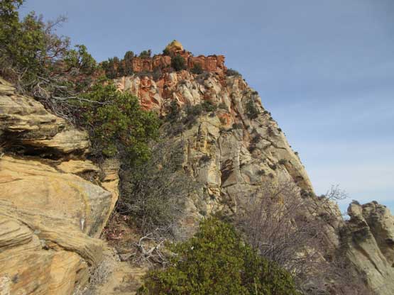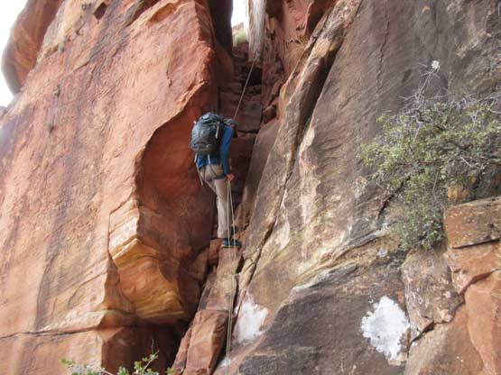 There’s one bushy and exposed step followed immediately after exiting the chimney and then the “trail” does a long horizontal traverse due south. Much of this traverse involves zero elevation change. Once at the southern end of this bench the “trail” then does a couple tight zig-zags and then there came the “dihedral crux”. The consensus is that this is the real crux of the route despite the lack of exposure. Jake volunteered to solo the pitch and then belayed the backpacks and myself up – very tricky even with rock shoes. The grade in Courtney Purcell’s book is 5.4 while most trip reports state 5.6-5.7 and because of my limited experience on sandstone slabs I’d agree with the latter.