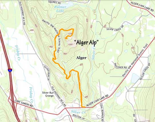 “Alger Alp” seems like a popular objective judging by the number of trip reports on the internet. The name is unofficial but has been commonly used. This peak can be hiked or biked from either the north or the south side with similar stats. The (gated) service roads extend all the way up and the bluff immediately under the summit offers some views to the west. I had been wanting to do it on a bike but spontaneously decided to hike it in the end.