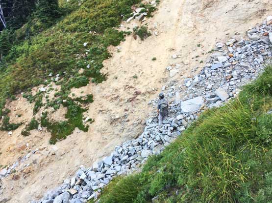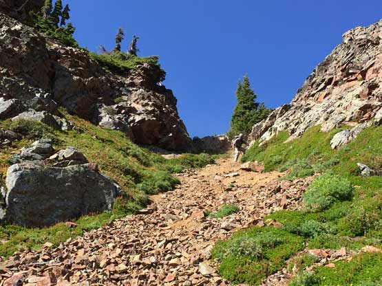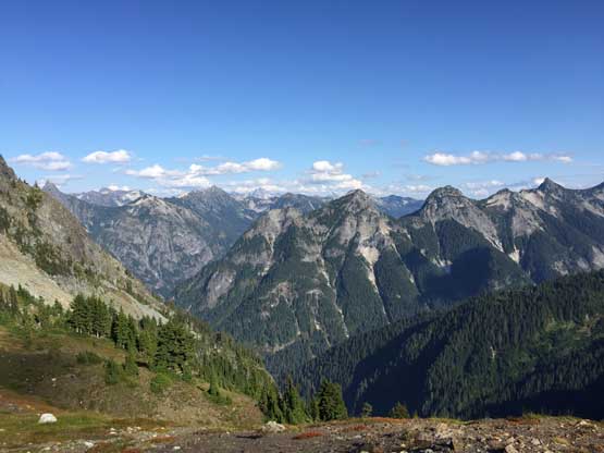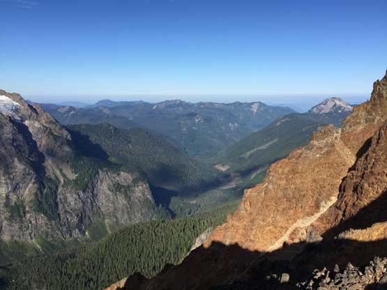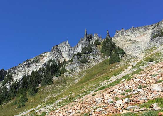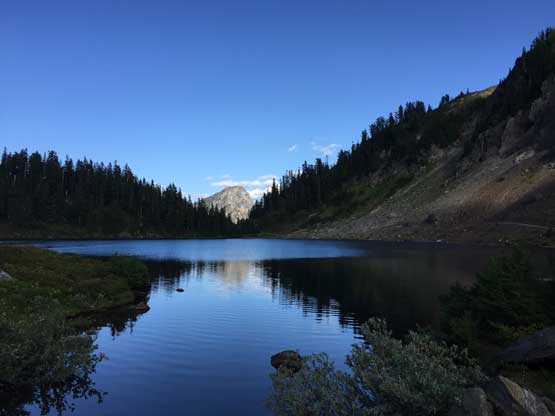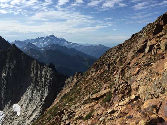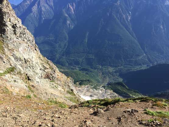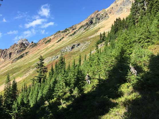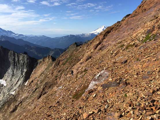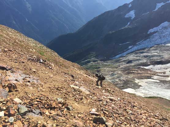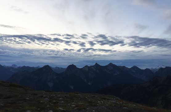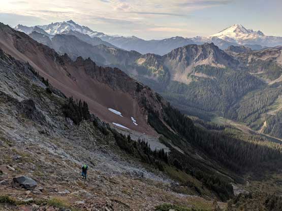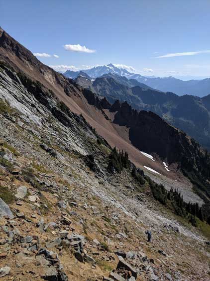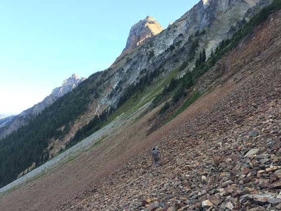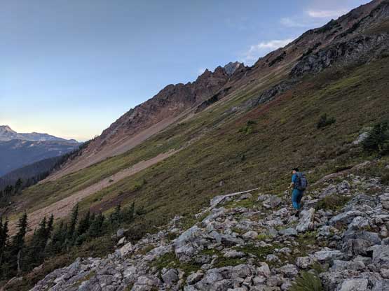 We only needed about 15 minutes of head-lamps before it’s bright enough to see. The trail ascended a little bit but then lost close to 100 m elevation while traversing around Winchester Mtn. towards Low Pass. This was frustrating. The hike up to High Pass involved unnecessarily many switchbacks which seemed like the norm in Washington state. Not wasting much time we picked up the easy-to-miss unmaintained trail down towards Gargett Mine, and made there in less than 1 hour after leaving the car. I spent a few minutes swapping trail-runners for mountaineering boots while Connor took his time loading up water bottles. This was the last reliable water source so we loaded 3 L each.
