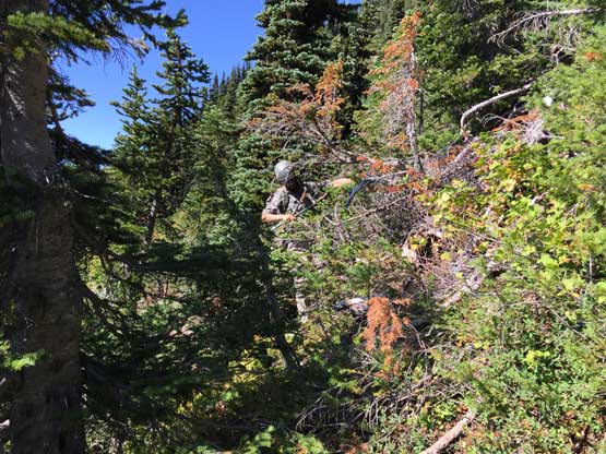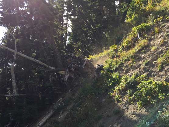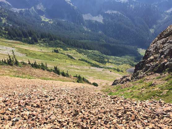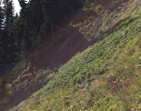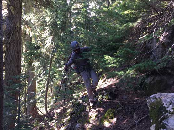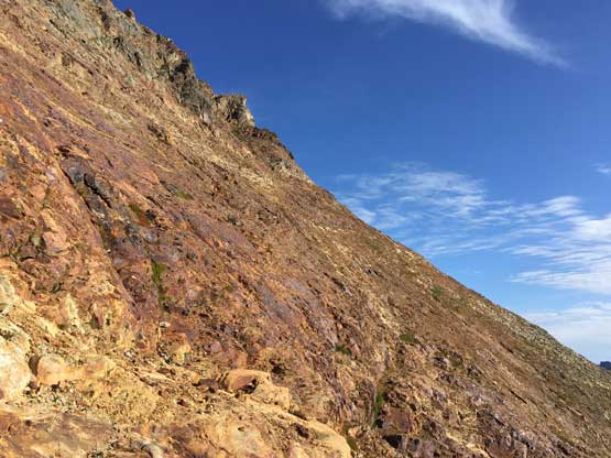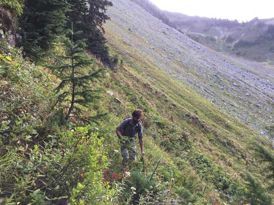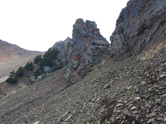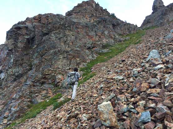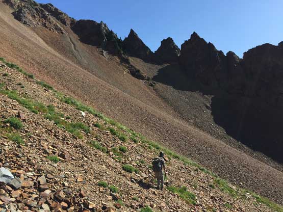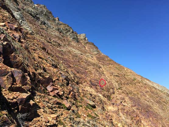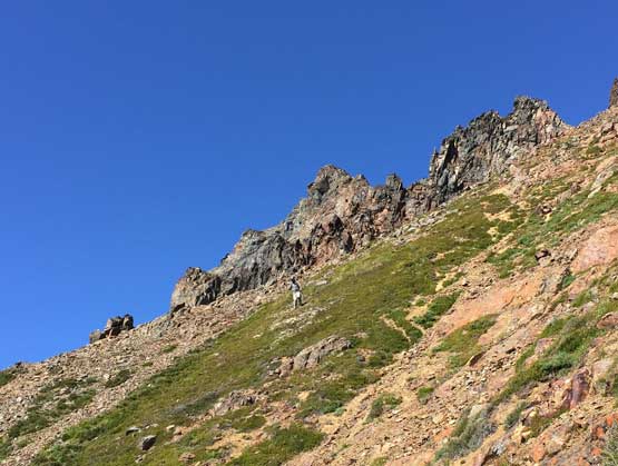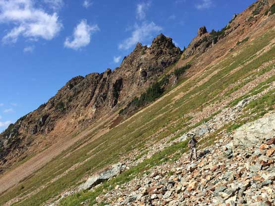 The first bowl traverse was the easiest, but also the most confusing. Other than aiming for the “SW Rib of Mt. Larabee at 5400-feet contour” we knew little about what exactly to expect. As soon as leaving the trail we got to taste the side-hill traversing on Larabee’s choss. We didn’t know what would be the best route so we aimed for a downward diagonal traversing bearing. The exact aiming and elevation was purely navigated by my Gaia GPS app and I have to say the technology did a great job. Right at around 5400 feet contour we noticed a zone of opening that appeared not super bushy, so went for it. We kept our bearing low and didn’t gain elevation until we were around that corner in the mature forest. This section of forested traverse was on some steep zones sandwiched between cliffs so it’s important to get it correct. After the corner turn Connor said we should take a sharp right gaining elevation but I somehow led us into a field of secondary growth and the bushwhacking was slow and wasteful in time. Onto the open terrain we were facing the second bowl traverse aiming for that obvious 6300-feet notch. This bowl started out easily on grass and scree but foreshortened, and to gain the notch required a long stretch of battle against red volcanic choss. It was as loose as Rockies’ treadmill scree but the rocks were bigger and not regular.