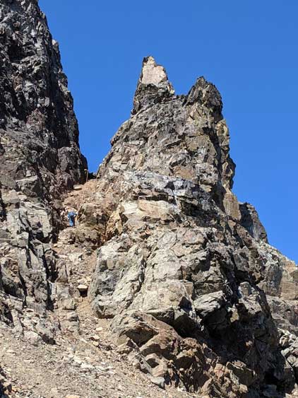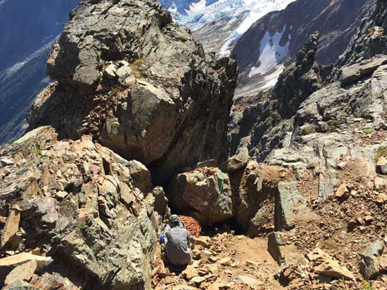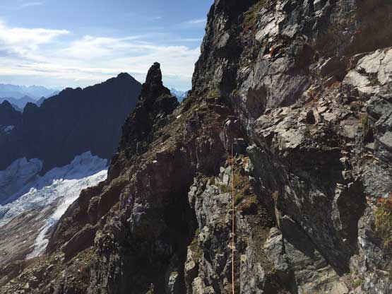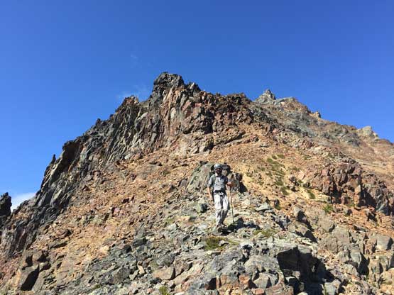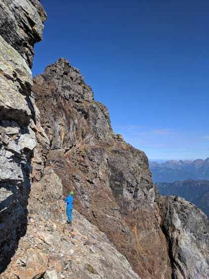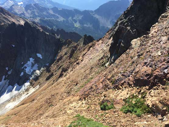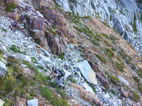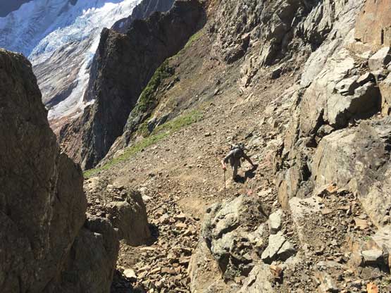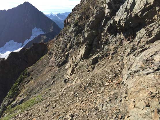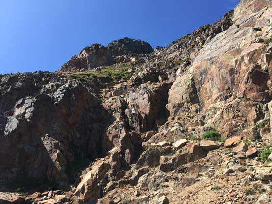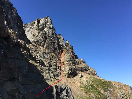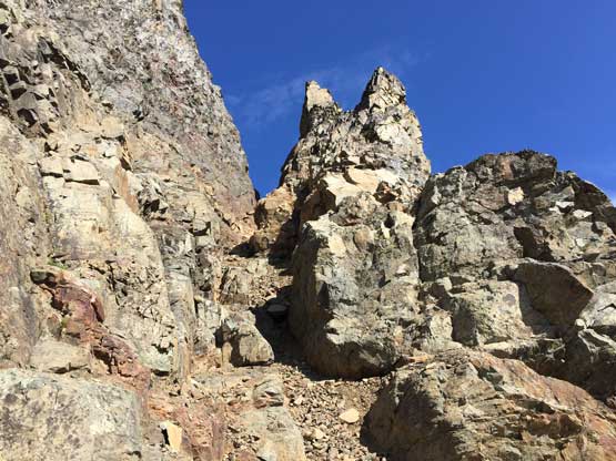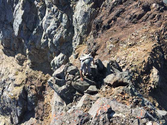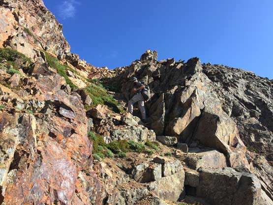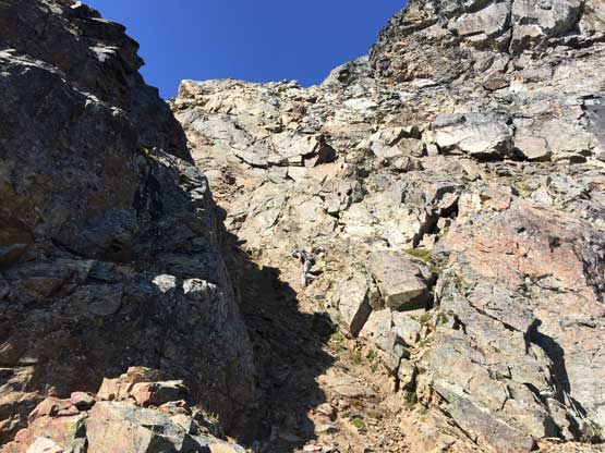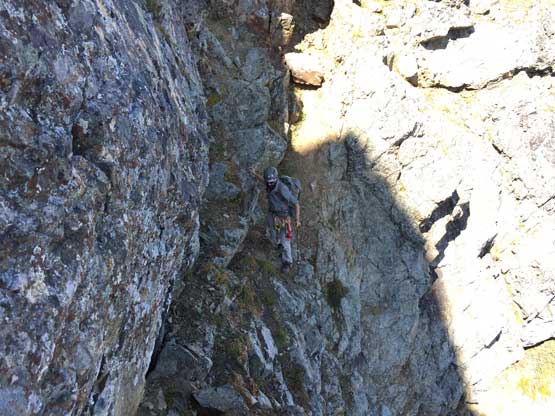At this point we were definitely ahead of schedule so no need to rush anymore. We took a half-an-hour break at the notch for food and energy and then ditched some water and food before resuming the ascent. From here onward we followed the exact description in Klenke’s beta. The first bit was ascending ~150 feet above the notch and then once making sense, we bailed onto the “red face traverse”. This diagonal traverse on down-sloping reddish choss was similar to one microscopic section on South Goodsir’s upper route but not as steep nor exposed. Other than keeping our eye on rock fall the technical challenge was trivial, and in no time we were already in that shallow gully climber’s left of “Gaulle’s Nose”. The gully had one step of “class 3+” but otherwise, no harder than “class 3”.