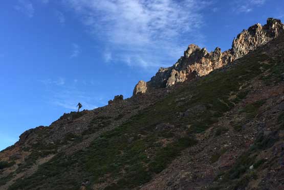 We took a short break at the 6300-ft notch separating the second and the third bowl before committing to the next stretch, the shittest of the approach. Descending from the notch required edging on some compact dirt followed by traversing a large slope of the aforementioned reddish choss. I knew this peak’s gonna be shit, so didn’t let those 4-letter words fly around, but I have to say that the terrain was pretty damn unpleasant. The next while involved contouring at a certain elevation dealing with a couple very shitty gullies that all involved some degree of compact choss, and a few short zones of bushwhacking. At some point we made the call to start ascending diagonally up towards the final notch at 6800-ft but the exact route wasn’t obvious. We scrambled on either steep grass/dirt or some down-sloping white/grey rocks on increasingly steep terrain. The route slowly began to make sense, and we eventually crested the notch and tasted the first beam of sunshine, about 3 hours after starting the day.