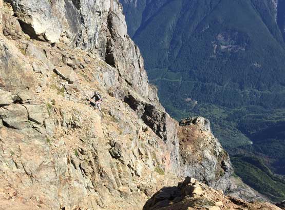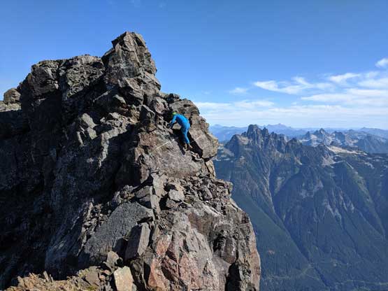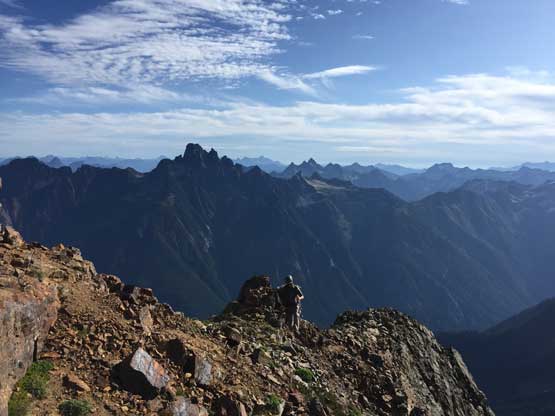 A couple years ago I had ascended the nearby Canadian Border Peak and that was a pretty tough day but I knew American Border Peak’s only gonna be tougher. The timing wasn’t difficult, but I waited patiently for the right partner. Towards the end of this past summer Connor and I had some talk about this summit and upon seeing a high pressure system kicking in towards the end of the first week of September we spontaneously pulled the trigger. We made the decision while scrambling Coquihalla Mtn. a mere two-day prior. The weather had been stable for a couple days and we figured that Friday might be the best shot of this season. There are a few ways to approach and ascend and the one we chose was the “standard route”, following the detailed description on SummitPost credit to Paul Klenke. We were both aware of a shorter approach from Tamihi Creek on B.C. side but we wanted to pick one with the least amount of uncertainty, and when it comes to beta Paul Klenke’s hard to beat. The standard approach of this peak starts from Twin Lakes and traverses/ascends three bowls around the S/SW/W side of Mt. Larabee on steep choss, bush and vegetation. This long traverse is not to be underestimated and “wet grass” is an absolute no-go. The standard “Southeast Route” requires a great deal of 3rd class scrambling on choss and two short pitches of climbing up to 5.4, complicated with route-finding and objective hazards from fallen rocks.