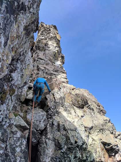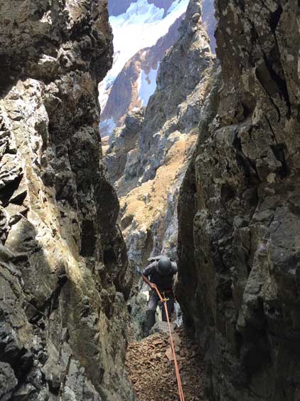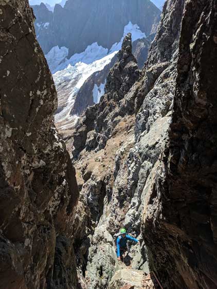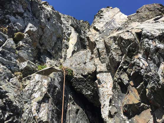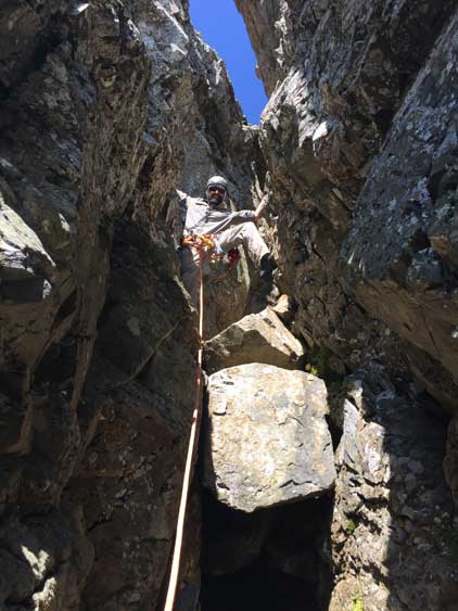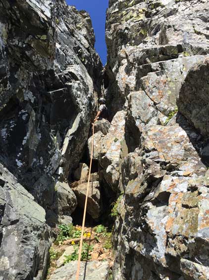 While sorting the rope we changed the belay station a little bit moving upwards to the immediate base of the chimney. Connor put two pieces, one cam and one nut to build a station and then swapped his footwear for rock shoes. I had brought rock shoes too but I decided against using them because I didn’t want to carry two pairs of boots through that tunnel. We had to carry one backpack and both of our boots through the tunnel because the upper mountain’s scramble wasn’t short and certainly not prime rock shoe terrain. I estimated that with two pairs of shoes in the backpack I probably wouldn’t fit through that tunnel, so no rock shoe for me. Connor made the initial 5.4 wall climber’s left of the chockstone easy and then gave me a belay from the middle of the this gully. Connor then led another pitch of 30 m with another 5th class chockstone right below the tunnel. The fan above the tunnel on the exit apparently had unavoidable choss and I got showered by a ton. Thankfully the belay station was relatively sheltered. Climbing this upper chockstone on mountaineering boots was challenging to say the least but I did free it without hauling the rope. Climbing through the tunnel was easy, but very unique, one of the coolest I’ve ever done. It’s definitely not big enough for a backpack so I removed the pack, pushed it through the tunnel and then crawled through.