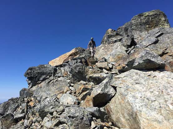 After taking another lengthy break for food and energy we made another food/water ditch before committing to the final scramble. The next stretch onto the summit (south) ridge was harder than anticipated with a great deal of compact dirt type of choss, and exposed scrambling at “class 3+”. We even saw a rappelling anchor above that zone on the ridge but we had already ditched the rope. The scramble along the ridge wasn’t bad but we incorrectly understood the beta. Traversing on the climber’s right (east) side of the ridge led us to a dead end and costed at least 15 min of time. Once backtracked we easily ascended “class 2” terrain on the west side of the ridge and suddenly popped out on the false summit with the final summit tower ahead. The tower appeared difficult and exposed, but had blocky positive holds (class 4-) and the next thing we were standing on the summit of American Border Peak. Not bad, not bad…