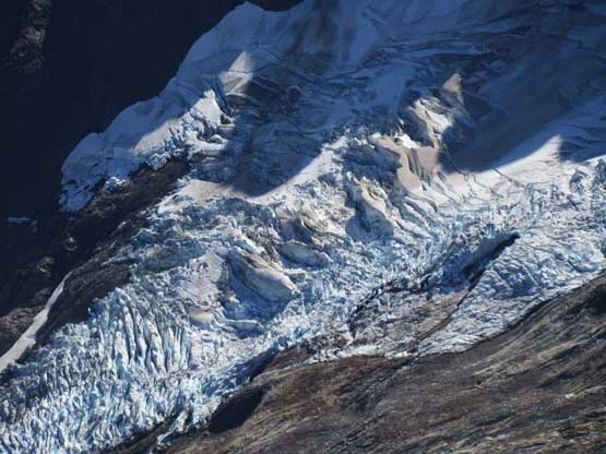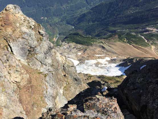 About half an hour later we leisurely started the descent. The down-climb of summit block required great care but was pretty straightforward. The down-climb of that stretch of compact choss above the crux chimney was very shitty though and I didn’t like it at all. If I had a chance I probably would opt to rappel but down-climbing was OK too. For the rappel the recommended way is to rappel through the tunnel but I had no idea how that’s possible with a backpack, so we had to rappel over the lip of that large chockstone making a challenging overhanging drop. Connor made it down with no problem, but just as I committed to the overhung the rope’s tension broke a piece of block into two, smashing onto my knee and legs and then bounces down the chimney, breaking into at least 50 pieces crushing towards Connor. We were both hit but somehow escaped injury although my right knee had some minor pain for at least a week after the trip. My knee’s pain was pretty bad at the time but didn’t seen to cause any functional issue so we were OK. The second rappel was easier than the first one. We then coiled the rope and soloed back across the “second key ledge traverse” and made another rappel into that “snow gully without snow”. The upper section of that gully was too shitty to down-climb. I waited for Connor to completely clean the path before making my own rappel. I pulled and coiled the rope in the middle of this gully, down-scrambled the rest, and traversed back across the “first key ledge traverse”.