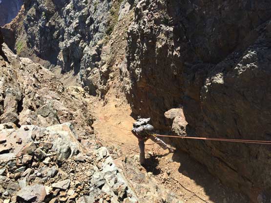 There came our first taste of “exposed compact dirt” immediately after dropping down the north side of “Gaulle’s Nose” onto the first key ledge traverse. This was aiming towards the “snow gully” aka. the first proper gully of the climb. The goats that we had been chasing up the mountain since the 3rd bowl traverse much lower down had finally deviated from the route we were going to take. They went farther right of the “snow gully” and that was a huge relief. After carefully negotiating compact dirt we made into that “snow gully” except for at this time of a year, there was absolutely no snow left there. It was a correct decision to not bringing ice axe nor crampons in this trip. The scramble in this gully started out with nothing but the typical chossy 3rd class but became sketchy about halfway up. The ground was extremely hardpacted and the walls had nothing solid to grab, or to press against. Connor made to the top first and I asked him to toss a rope down so that I could just easily batman up the rope. I then led the second key ledge traverse placing two cams that probably wouldn’t hold had I fall, and belayed Connor across at the base of the crux chimney. In retrospect we should have just soloed this ledge. It’s very exposed but not difficult (class 3+).