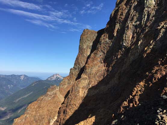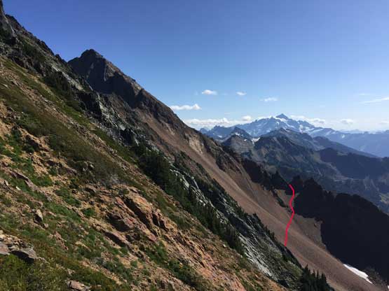 At this point we were definitely ahead of schedule so no need to rush anymore. We took a half-an-hour break at the notch for food and energy and then ditched some water and food before resuming the ascent. From here onward we followed the exact description in Klenke’s beta. The first bit was ascending ~150 feet above the notch and then once making sense, we bailed onto the “red face traverse”. This diagonal traverse on down-sloping reddish choss was similar to one microscopic section on South Goodsir’s upper route but not as steep nor exposed. Other than keeping our eye on rock fall the technical challenge was trivial, and in no time we were already in that shallow gully climber’s left of “Gaulle’s Nose”. The gully had one step of “class 3+” but otherwise, no harder than “class 3”.