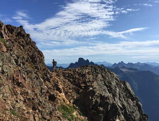A couple years ago I had ascended the nearby Canadian Border Peak and that was a pretty tough day but I knew American Border Peak’s only gonna be tougher. The timing wasn’t difficult, but I waited patiently for the right partner. Towards the end of this past summer Connor and I had some talk about this summit and upon seeing a high pressure system kicking in towards the end of the first week of September we spontaneously pulled the trigger. We made the decision while scrambling Coquihalla Mtn. a mere two-day prior. The weather had been stable for a couple days and we figured that Friday might be the best shot of this season. There are a few ways to approach and ascend and the one we chose was the “standard route”, following the detailed description on SummitPost credit to Paul Klenke. We were both aware of a shorter approach from Tamihi Creek on B.C. side but we wanted to pick one with the least amount of uncertainty, and when it comes to beta Paul Klenke’s hard to beat. The standard approach of this peak starts from Twin Lakes and traverses/ascends three bowls around the S/SW/W side of Mt. Larabee on steep choss, bush and vegetation. This long traverse is not to be underestimated and “wet grass” is an absolute no-go. The standard “Southeast Route” requires a great deal of 3rd class scrambling on choss and two short pitches of climbing up to 5.4, complicated with route-finding and objective hazards from fallen rocks.