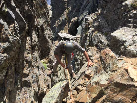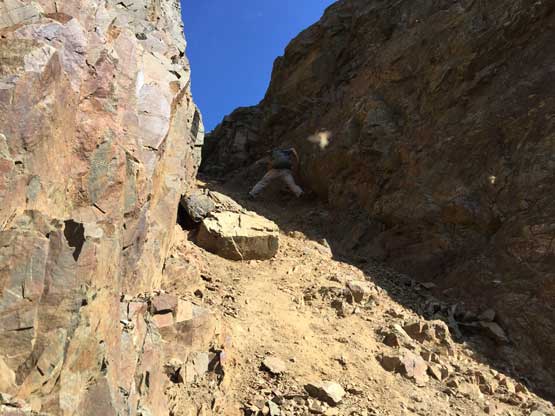 There came our first taste of “exposed compact dirt” immediately after dropping down the north side of “Gaulle’s Nose” onto the first key ledge traverse. This was aiming towards the “snow gully” aka. the first proper gully of the climb. The goats that we had been chasing up the mountain since the 3rd bowl traverse much lower down had finally deviated from the route we were going to take. They went farther right of the “snow gully” and that was a huge relief. After carefully negotiating compact dirt we made into that “snow gully” except for at this time of a year, there was absolutely no snow left there. It was a correct decision to not bringing ice axe nor crampons in this trip. The scramble in this gully started out with nothing but the typical chossy 3rd class but became sketchy about halfway up. The ground was extremely hardpacted and the walls had nothing solid to grab, or to press against. Connor made to the top first and I asked him to toss a rope down so that I could just easily batman up the rope. I then led the second key ledge traverse placing two cams that probably wouldn’t hold had I fall, and belayed Connor across at the base of the crux chimney. In retrospect we should have just soloed this ledge. It’s very exposed but not difficult (class 3+).