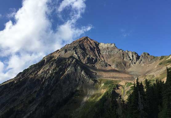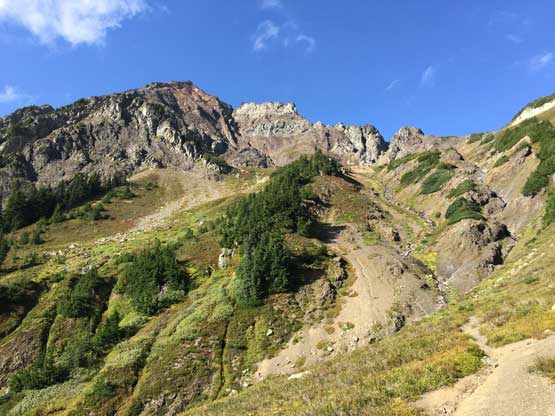 We only needed about 15 minutes of head-lamps before it’s bright enough to see. The trail ascended a little bit but then lost close to 100 m elevation while traversing around Winchester Mtn. towards Low Pass. This was frustrating. The hike up to High Pass involved unnecessarily many switchbacks which seemed like the norm in Washington state. Not wasting much time we picked up the easy-to-miss unmaintained trail down towards Gargett Mine, and made there in less than 1 hour after leaving the car. I spent a few minutes swapping trail-runners for mountaineering boots while Connor took his time loading up water bottles. This was the last reliable water source so we loaded 3 L each.