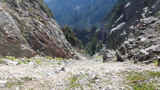 I stayed for less than half an hour as time was slowly getting on. While reversing the upper slopes I ended up getting lost briefly, firstly too far down skier’s right and then too far skier’s left. Too lazy to back-track I ended up having to down-climb a short, but wet 3rd class crux to rejoin the trail. Descending the gully from the main/south summits col was just as tedious and tiring but at least faster than grunting up. Lower down into the “boulder basin” I stayed on the north side to avoid as much as hopping as possible and I have to say this did work out pretty well. The rest of the game was simply following the trail back to the parking lot with sections pretty steep for descending.