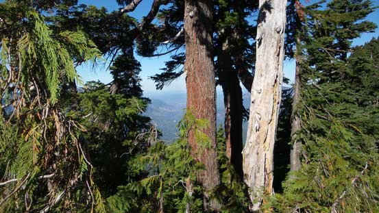 The next stage was following the spine of a (forested) ridge due south-east. I thought this section would have some views but nope. The whole ridge walk was done under a thick canopy although the trail was still in a decent shape. After a long while this trail drops, and then traverses into a forested bowl on the south side before re-ascending steeply back to the ridge crest and then into a “boulder basin”. I finally got some views from the basin although there’s still not a lot of things to see. One feature that caught my attention immediately was the steep gully to the high col between the main and south summits. That part did not look fun to me at all… And then traversing across this “boulder basin” was a bit tedious too as I lost the trail and had to hop over some pretty sizeable rocks. The grunt up the aforementioned gully wasn’t as bad though as the grade was much mellower than appeared from far afar.