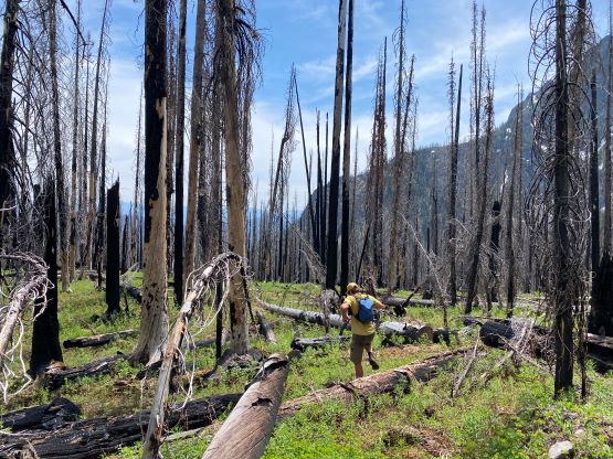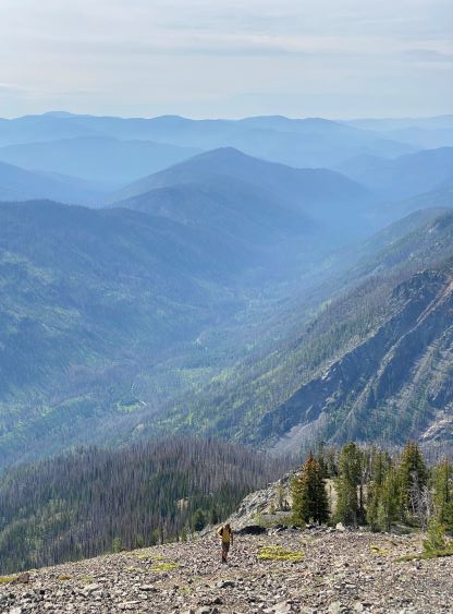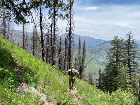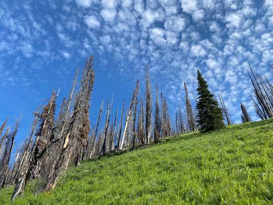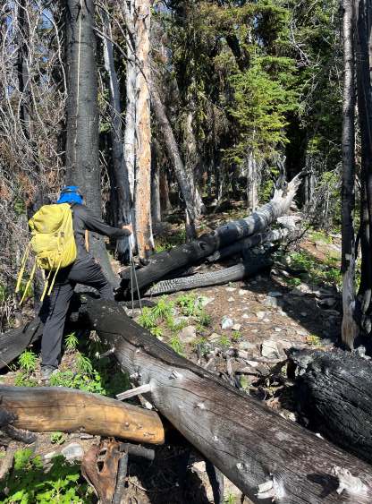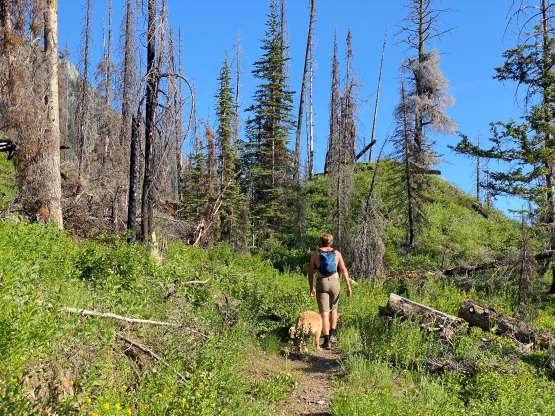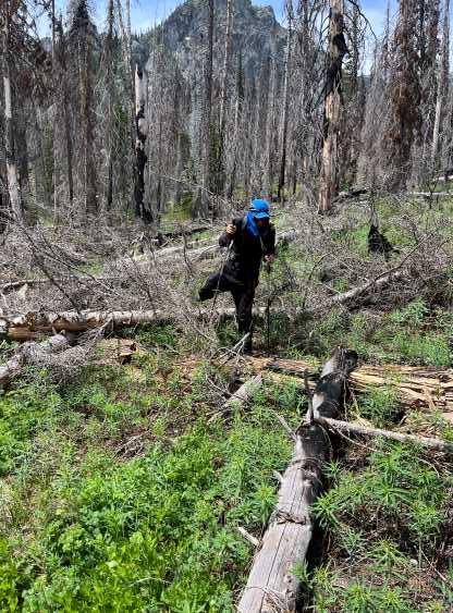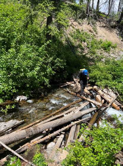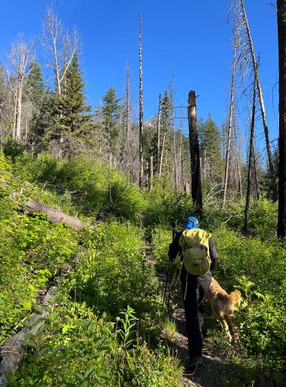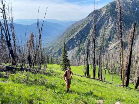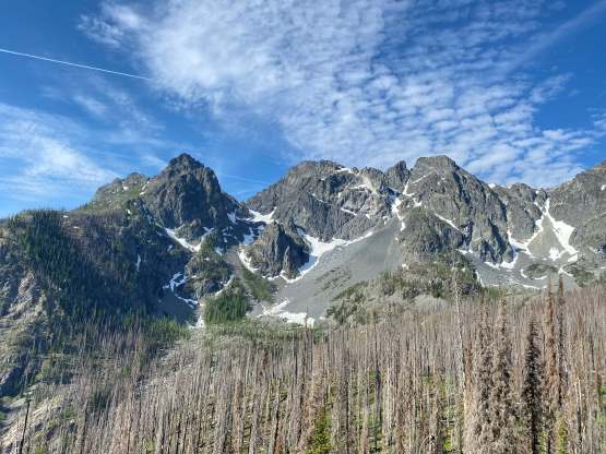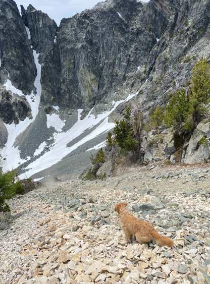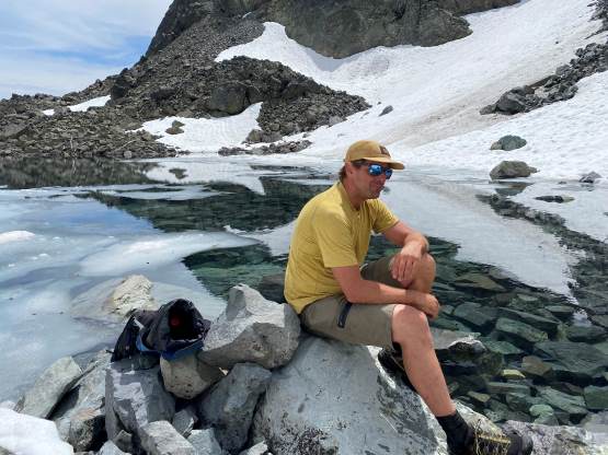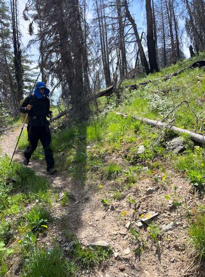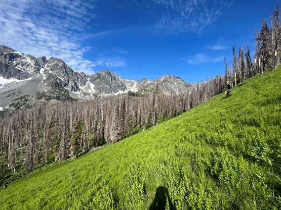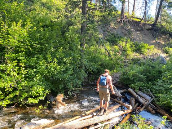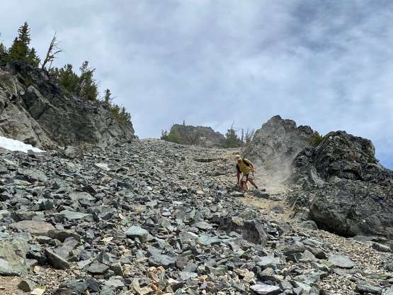 On the descent we simply retraced our route until about 3/4 of the way down that SE Face where I previously located a scree chute that would bring us directly down to the uppermost tarn. We did not have a reference about this chute, but the satellite images suggested it would definitely “go”, so down we went. This turned out to be a direct and fast descent. The only downside was the loose rocks but we were fine with that. We finally got our much-needed source of water upon glissading to this uppermost tarn, and we both simply drank straight from the tarn even though it appeared rather stagnant. After this much-needed break we glissaded another slope to a lower lake where Twig went in for a swim. Matt contented about doing that as well, but opted not. I then followed Matt’s lead descending the forest staying entirely on the north (skier’s left) side of the creek, dealing with dead-falls and some minor, but not worth-noting bushwhacking. This forested descent eventually brought us back to the trail and we both started jogging. I wanted to see how far I could trail-run and I managed to keep going for several kilometers. I eventually felt some blisters and stopped running, but power-walked the final stretch back to the Jeep. Our round trip time was under 6 hours. The day was still young so we must carry on to tag Tiffany Mountain.