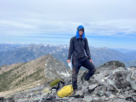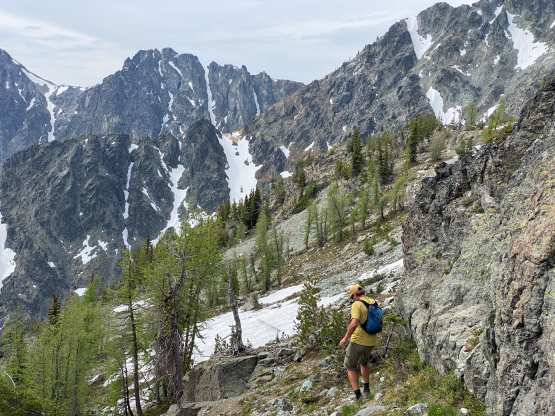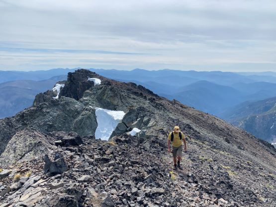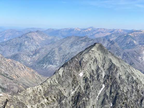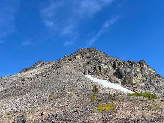 I learnt from Matt to travel light. We had fresh beta from peakbagger.com that snow gears were no longer needed for the season, so I left the crampons and the mountaineering boots in the vehicle and travelled with solely trail-runners. I also left some redundancies such as InReach, helmet, gloves and extra jacket behind since going out with Matt every gram matters. With the lightened pack I immediately felt the easiness of going since I rarely hiked without those stuffs. In fact, we were almost “too fast for the mosquitoes” as they were never able to catch up. The initial 600 m elevation was dispatched using a good trail until we came to some intermittent meadows where the trail intersects the broad SE Ridge of Big Craggy Peak. We left the trail at the meadows and ascended the open slopes on the SE Ridge. There wasn’t much route-finding as the ridge was open without much micro-terrain, so we gained elevation even quicker.
