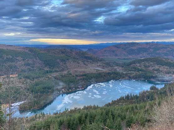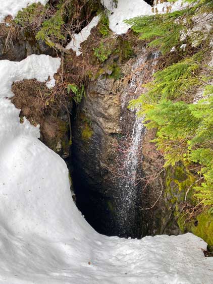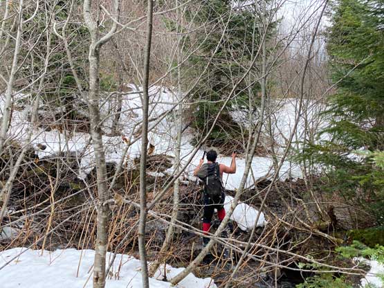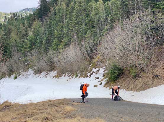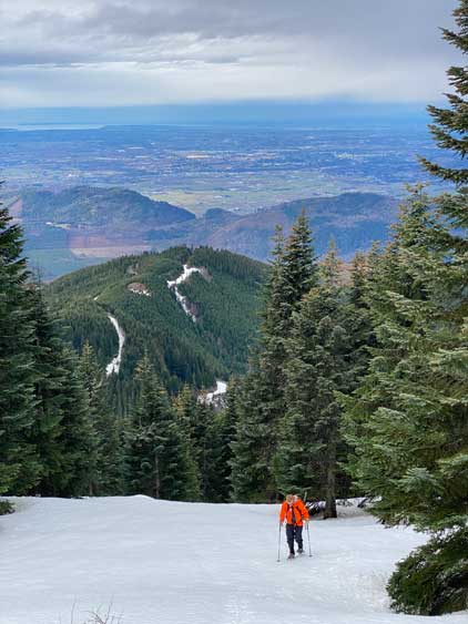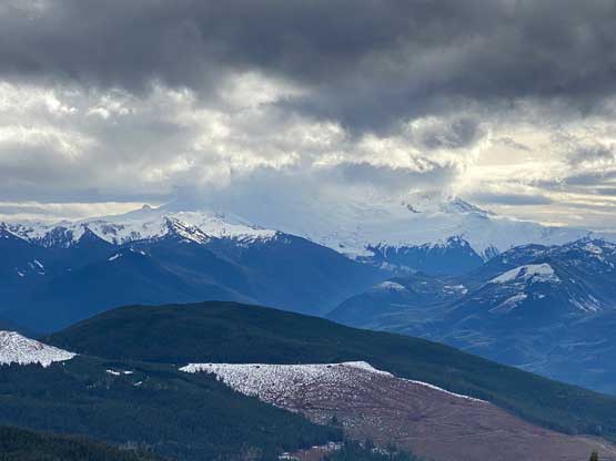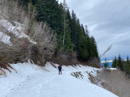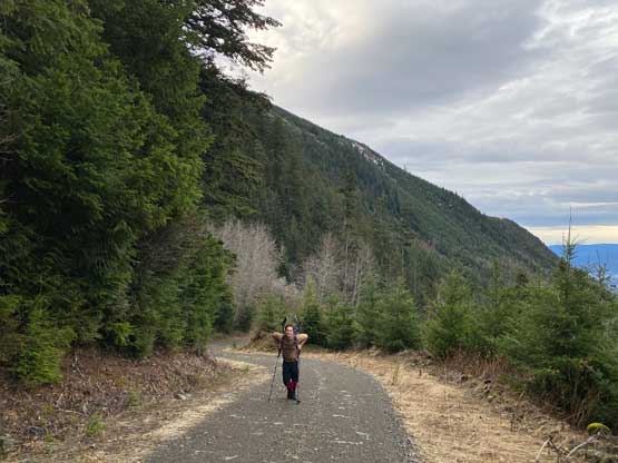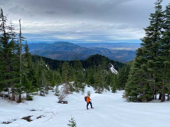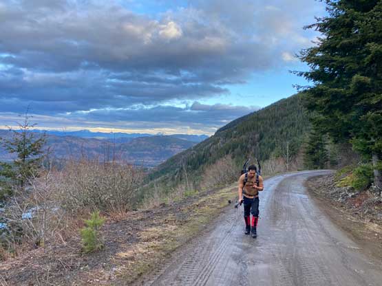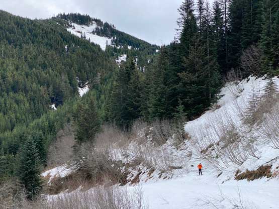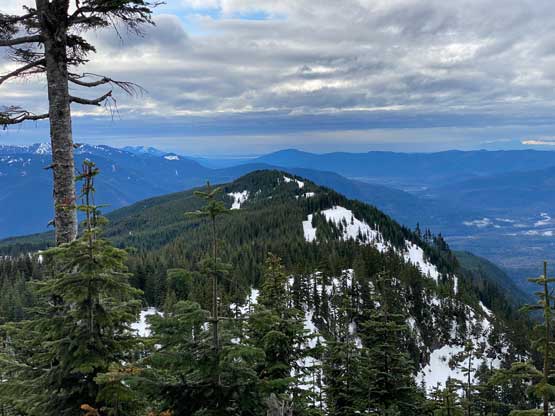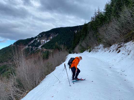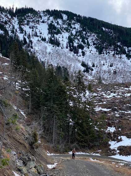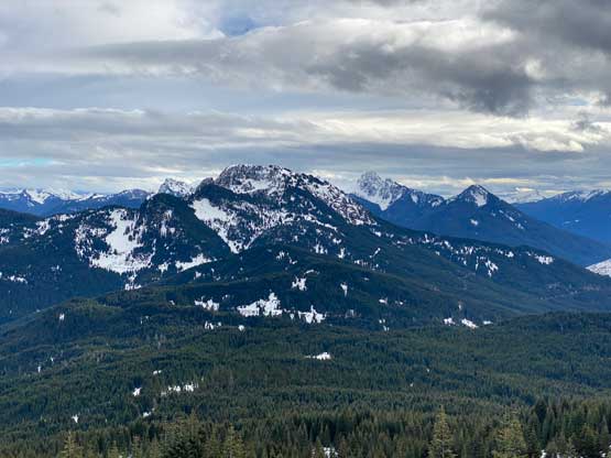 The lower 7-8 km of this route was nothing but plodding on a well-graded FSR. If not because of the gate I’m sure a low-clearance AWD vehicle could easily make to the end. There were more views than anticipated including several spots that offered unobstructed views down to the partially-frozen Silver Lake. At around 670 m elevation we were supposed to take the secondary road to the right but we blindly followed the mainline. Thankfully I realized the mistake a mere minute later so we backtracked. This secondary spur road led us to the upper set of switchbacks and an enormous cut-block at 1000-1100 m elevation. We encountered patchy snow and some minor post-holing but the snow was never continuous. The next stop was at the 1150 m saddle on the extended SW Ridge. The portion of the FSR on the north side of this saddle was very snowy so I opted to stop and switch footwear from trail-runners to mountaineering boots. The trail-runners were subsequently ditched at this saddle to lighten the pack weight.