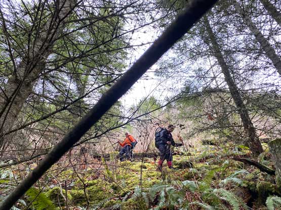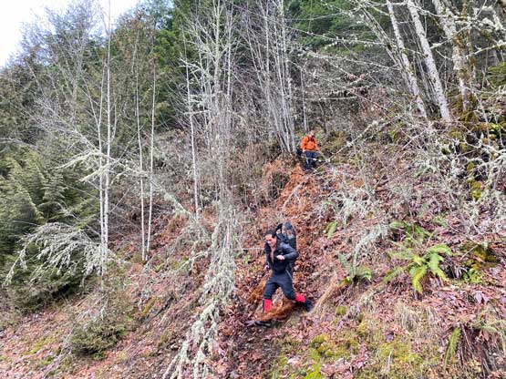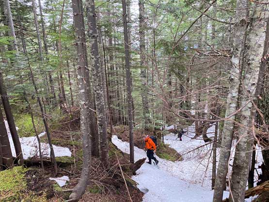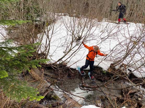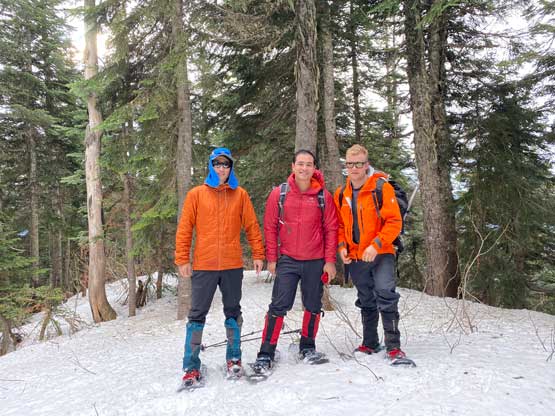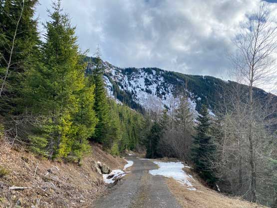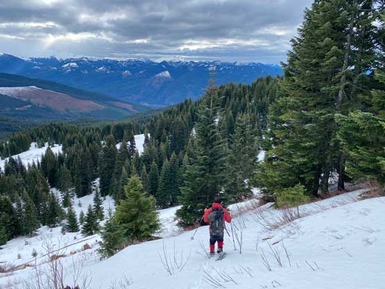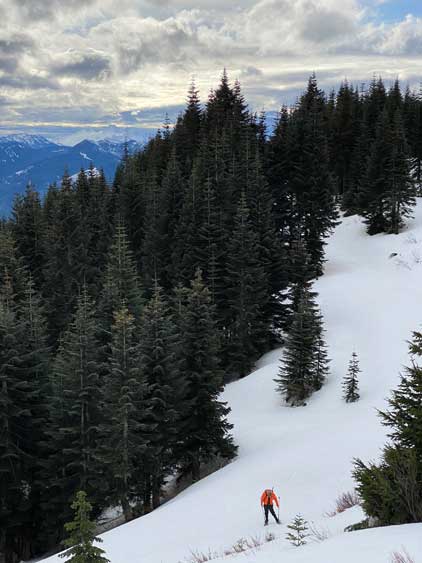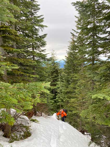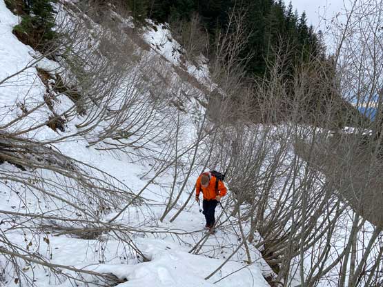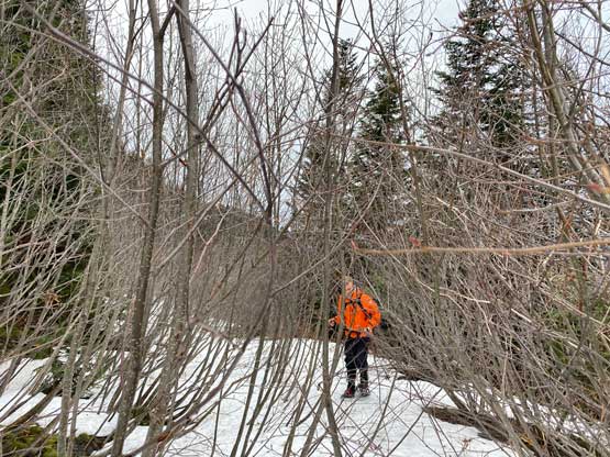 We briefly tried to boot-pack the FSR but within a minute we came to the conclusion that the snowshoes were indeed required, so the packs became even lighter. The original plan was to ascend the steep SW slopes onto the NW Ridge but upon seeing an old and overgrown (but snow covered) FSR heading into the woods I spontaneously decided to lead us into the “western drainage” aiming for the south ridge uppermost saddle. There are many ways to ascend the upper portion of this mountain so it really didn’t matter that much. The route we picked proved to be fairly bushy for at least half an hour. The slope was steep and the snow was slushy so our progress was slow and treacherous. The conditions didn’t improve until 100 vertical meters under the south ridge where we finally exited the trees into a large opening. The snow was crusty and supportive likely because of the re-radiation freeze overnight.
