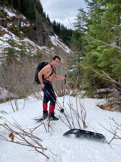 The lower 7-8 km of this route was nothing but plodding on a well-graded FSR. If not because of the gate I’m sure a low-clearance AWD vehicle could easily make to the end. There were more views than anticipated including several spots that offered unobstructed views down to the partially-frozen Silver Lake. At around 670 m elevation we were supposed to take the secondary road to the right but we blindly followed the mainline. Thankfully I realized the mistake a mere minute later so we backtracked. This secondary spur road led us to the upper set of switchbacks and an enormous cut-block at 1000-1100 m elevation. We encountered patchy snow and some minor post-holing but the snow was never continuous. The next stop was at the 1150 m saddle on the extended SW Ridge. The portion of the FSR on the north side of this saddle was very snowy so I opted to stop and switch footwear from trail-runners to mountaineering boots. The trail-runners were subsequently ditched at this saddle to lighten the pack weight.