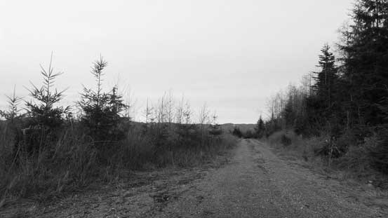 More than halfway up we came to a Y-junction with the well-travelled path going to our right. I double-checked my GPS and confirmed that we should go left. The snowshoes were ditched soon as it’s getting apparent that we wouldn’t need them on this day. The left branch (also in a good shape) led us to a long contouring around the west flanks of the upper hill, and just before it’s starting to drop height we turned right up a smaller road. By now we were very close to the summit area and just before this secondary road starting to lose elevation we picked up another (narrower and more overgrown) fork branching off to our left. This fork led us back into some taller trees and the summit was in the forest with zero view. We came back to the open area and had a short break before starting the descent.