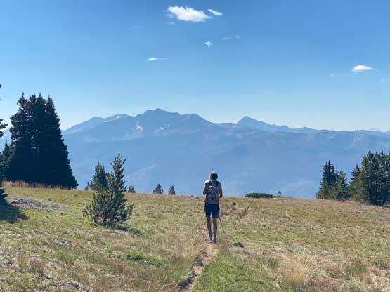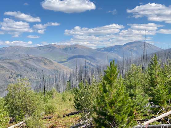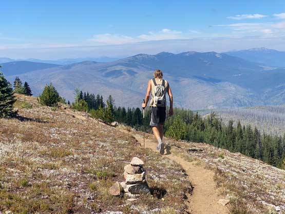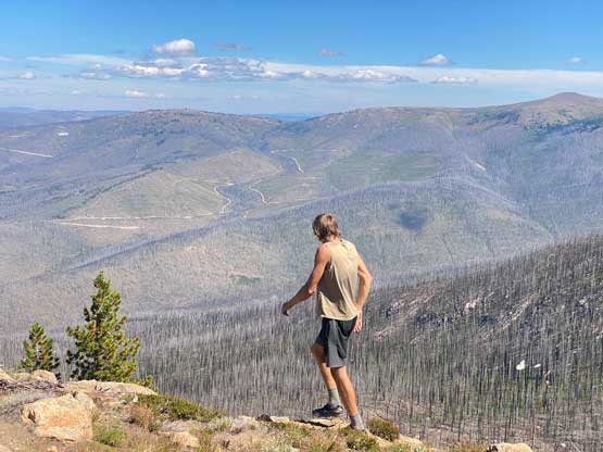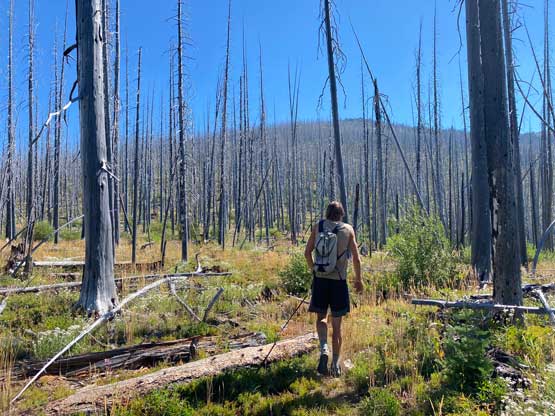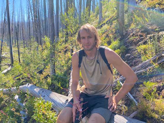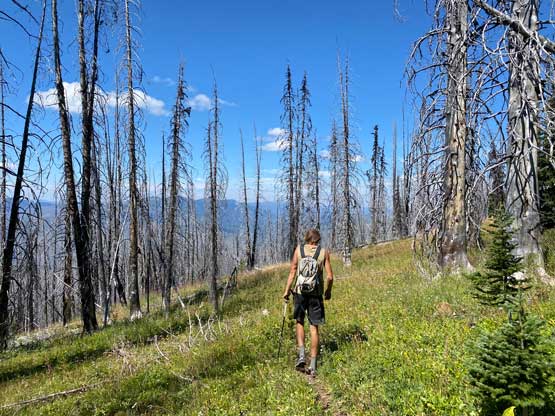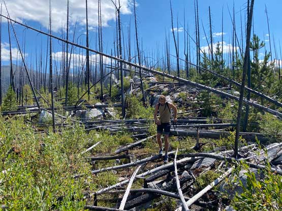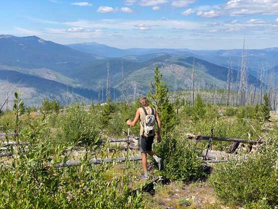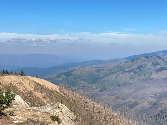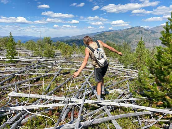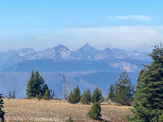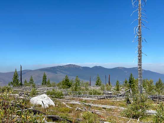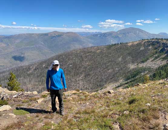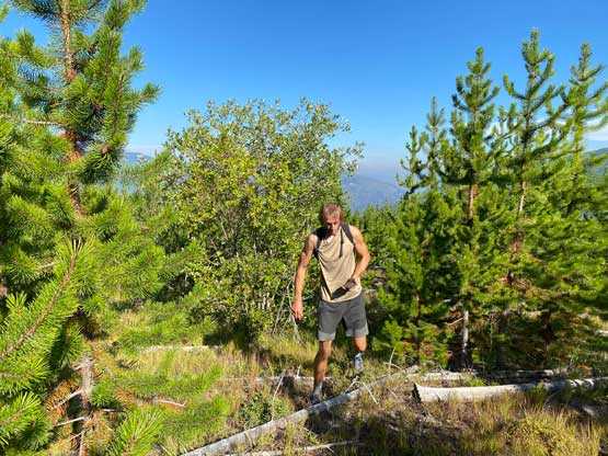 We kept checking the maps to see how far we still had to bushwhack to reach Boundary Trail on the west side of Bunker Hill and the progress took a lot longer than anticipated. It was a few kilometers’ of bushwhacking to get there. This was shaping up to become an “ultimate” definition of dumpster-diving but thankfully the upper mountain wasn’t as bad. Once joining the trail we had a pleasant hike to the summit covering another 3 km distance. The trailed portion was also longer than expected, but with good views into the Pasayten and northwards into Canada. From the summit we could see the bulk mass of Sheep Mountain to the east as well as some familiar Bulgers from unfamiliar angles. We even caught some strong cell receptions so we spent about an hour reconnecting to the society.