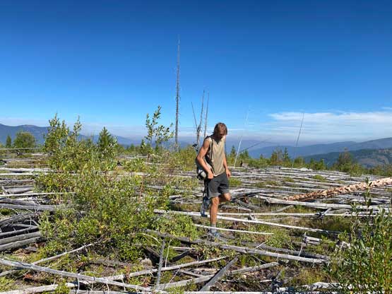 Due to the lack of cell reception we couldn’t download the satellite images so the navigation would have to be done purely on Gaia’s topo map. For complicated logging roads assisted hikes in lesser-known areas the Gaia map can be undertooled and this one was surely the case. The spur “road” shown on the map was basically too overgrown to walk on, so we made the decision to just bail into the bush to go straight up the slopes. The bushwhacking was definitely annoying, but within a tolerable range. After a while we popped onto another road that seemed much more defined and followed that road to the end, within 500 m from BC/WA border. We talked about to take this road back on the descent but we had no idea where this road originated from. The thrash to the border was starting to become worse and the worst was the first kilometer on the Washington side of the border. We were literally traversing ground that every square foot is filled in with pick-up-sticks. Thankfully those sticks weren’t super mangled so we were actually able to maintain a steady pace. This trip started to become stupid again but we were already too far into the pain to cut the loss. This was overall not a long hike so we were committed to get the job done.