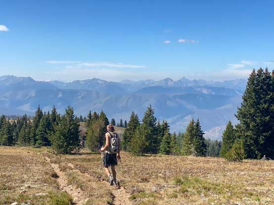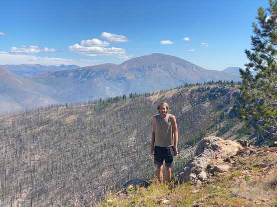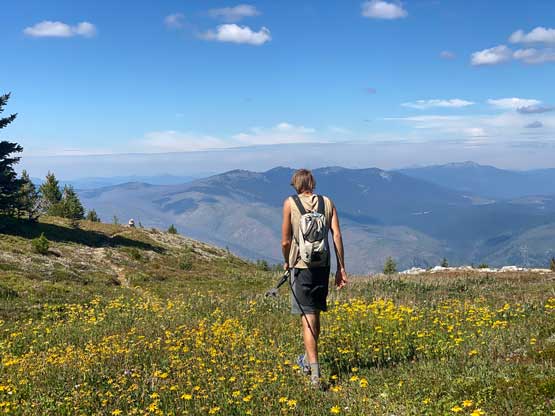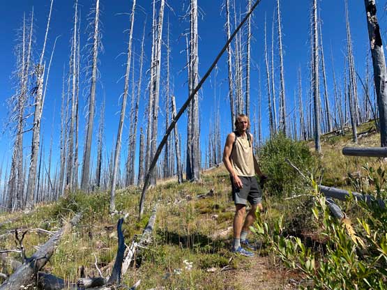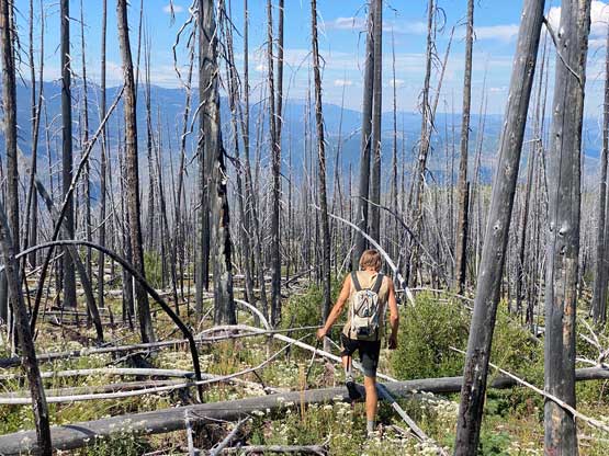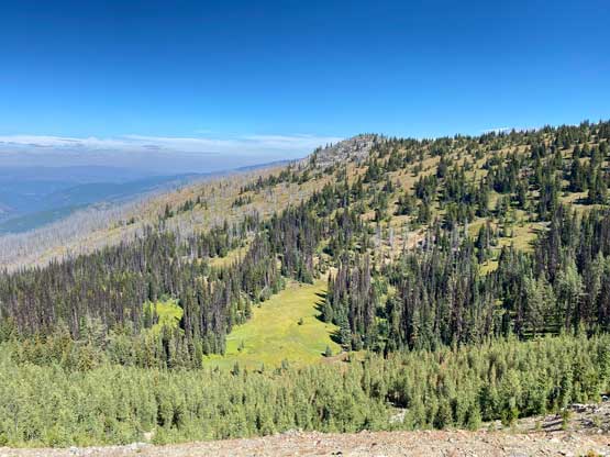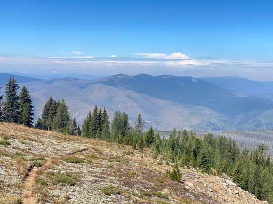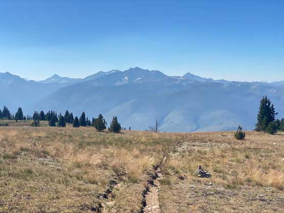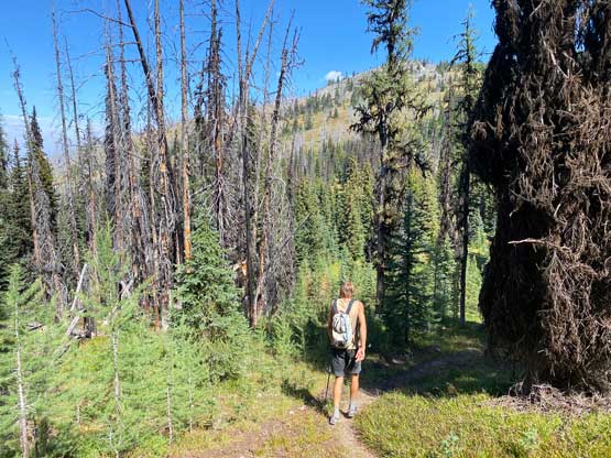 We kept checking the maps to see how far we still had to bushwhack to reach Boundary Trail on the west side of Bunker Hill and the progress took a lot longer than anticipated. It was a few kilometers’ of bushwhacking to get there. This was shaping up to become an “ultimate” definition of dumpster-diving but thankfully the upper mountain wasn’t as bad. Once joining the trail we had a pleasant hike to the summit covering another 3 km distance. The trailed portion was also longer than expected, but with good views into the Pasayten and northwards into Canada. From the summit we could see the bulk mass of Sheep Mountain to the east as well as some familiar Bulgers from unfamiliar angles. We even caught some strong cell receptions so we spent about an hour reconnecting to the society.