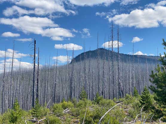 This happened to be the case on this Monday. Matt Lemke drove north to give Castle Peak an attempt and I agreed to join. We decided to follow Eric Gilbertson’s route but taking bikes to shorten the approach. The idea seemed brilliant but the reality was cruel. We arrived at Monument 83 trail-head the night before only to see a trail closure sign saying some bridges were out. We ignored the closure sign as usual and even carried the bikes over two creeks (taking shoes off) but then we encountered hundreds of dead-falls. Lifting the bikes over some dead-falls wouldn’t be problematic, but within a few kilometers we had seen 100 of them. This was starting to become stupid so we made the decision to cut the loss and go back. After wasting 2 hours for nothing we were back to the truck. I threw out a few possible consolation objectives including Three Brothers and Chuwanten but clearly Matt was more keen on peaks in Washington. Matt picked Bunker Hill out of the three suggestions. This would be my last pick out of the three, but it’s on my “list” so I agreed to give it a try. The access road seemed to be in a better shape than last time I was here, such that we cruised down to mainline in no time. The spur roads labelled on my maps seemed rather non-existent so we turned around and parked on the main road. We pushed the bikes for about 100 m into the overgrown spur road and locked them onto a tree. These two fatbikes together worth over 10,000 dollars so we didn’t want to risk losing them.