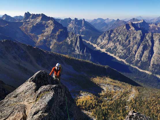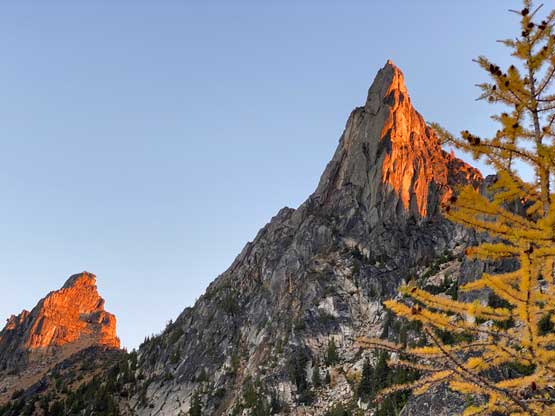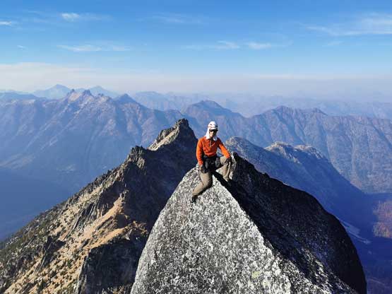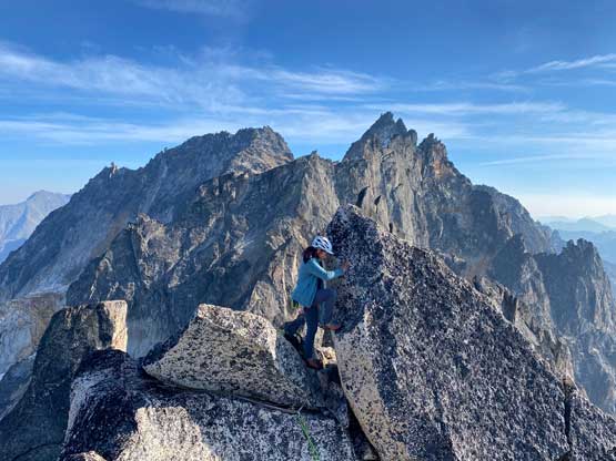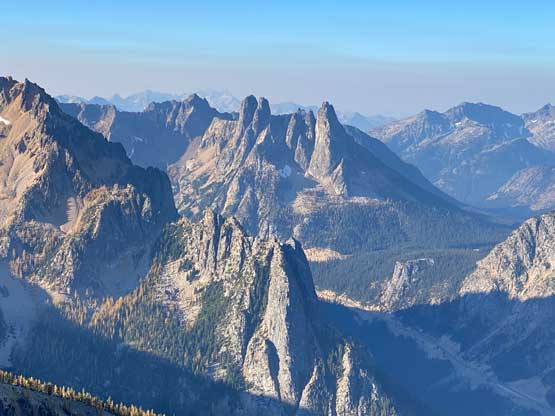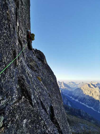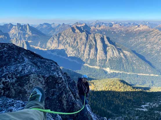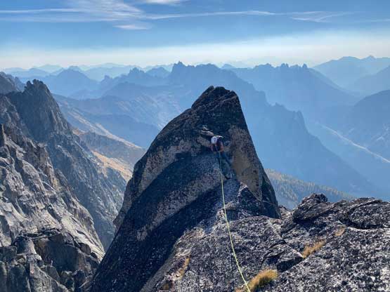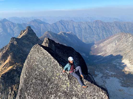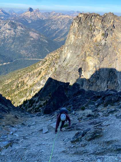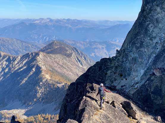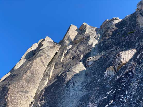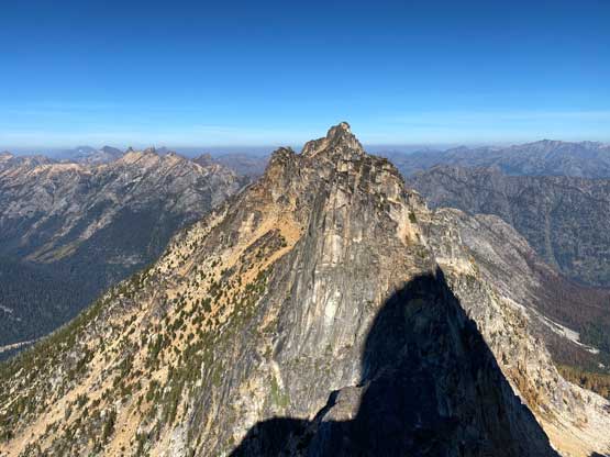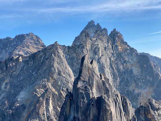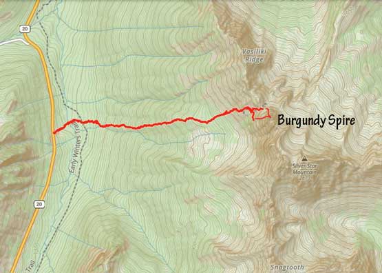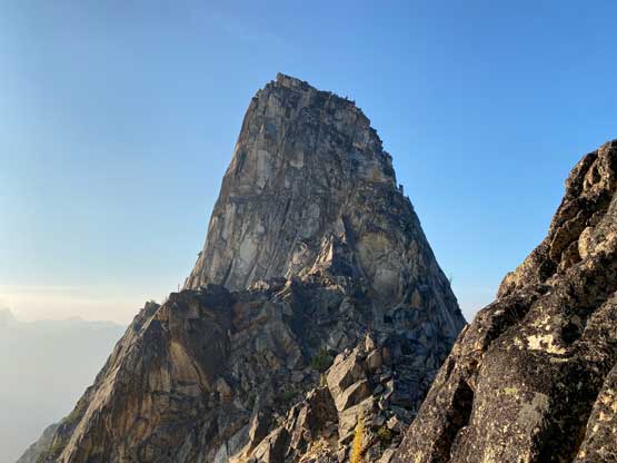 “Burgundy Spire” is one of the 4 major towers in the group of peaks called the “Wine Spires”. These spires aren’t forming a stand-alone massif but are rather attached to the much-bigger Silver Star Mountain. The prominences of these spires are all well under 100 m but all of them require extensive amount of technical climbing. In fact, the “Wine Spires” are considerably harder than the more fabled Liberty Bell Group speaking of their respective easiest routes. “Burgundy Spire” isn’t the tallest in this group but is definitely the most popular as the route is well documented on the internet. This peak is also included in Dallas Kloke’s “Washington Difficult Ten” and is the only one in that list that does not have a heinous approach. The difficulty of this peak comes purely from the rock climbing challenges.