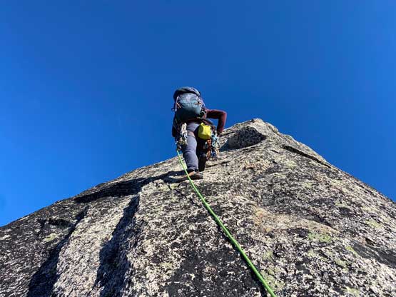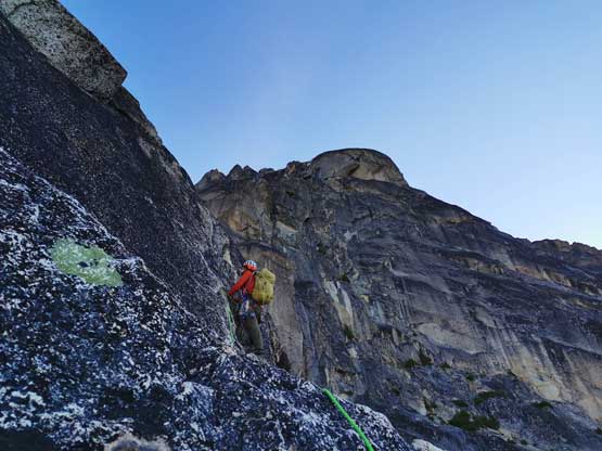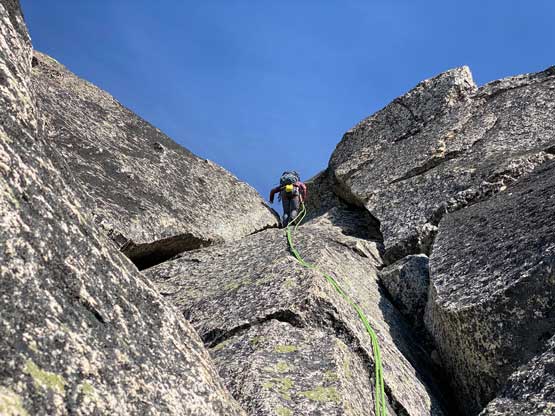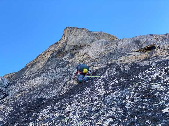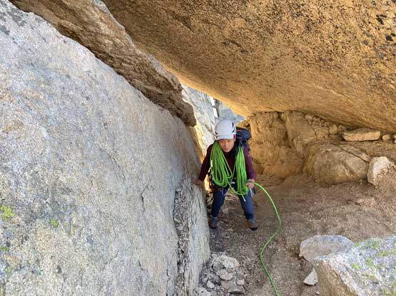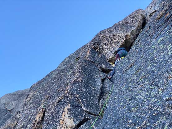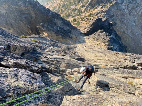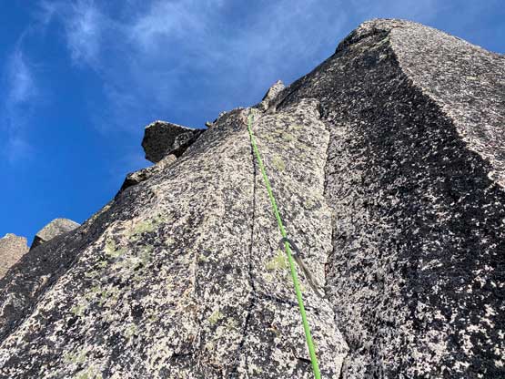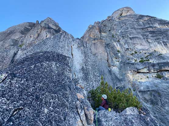 I was warned by others that the start of Burgundy Spire from Paisano link-up would be loose and dangerous but the climbing wouldn’t be too difficult, so I instantly volunteered to lead our 1st pitch on Burgundy Spire. We again, ditched more unnecessary gears at the bottom as from this point upwards we would be descending the same route as on ascent. I actually called us to scramble half a pitch higher before starting to belay as although loose, the terrain seemed to be mostly “class 4” here. I then led through the lower section of the amphitheatre ahead, dealing with a greater deals of insecure flakes and loose rocks. The climbing never seemed to exceed 5.6 but the consequence would be high. We had agreed to climb more or less in a straight-up fashion through this amphitheatre to avoid the dangerous traversing pitch in the middle of it, but the terrain kept forcing me to ascend climber’s left. I eventually made a few moves to counter the terrain and belayed Winnie from a boulder in the middle of the supposed horizontal traverse. Winnie then led a more-or-less straight up pitch to get us out of the amphitheatre and this pitch took a while. We tried not to make any more horizontal traverses as some other climbers had gotten hurt by doing that, but climbing straight-up was more technical and involved much more route-finding on lichen covered slabs. The exit of this pitch was also vertical but the climbing was mostly 5.7-5.8. Seconding this pitch didn’t impose any problem to me but this was a stressful fair for Winnie to lead. The two pitches that we just did to climb out of the amphitheatre were also almost 60m long and the nature of the north face of Burgundy Spire felt much more “alpine” than down on the west ridge of Paisano Pinnacle.
