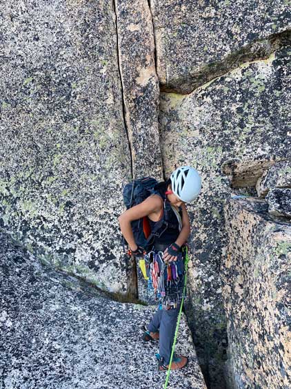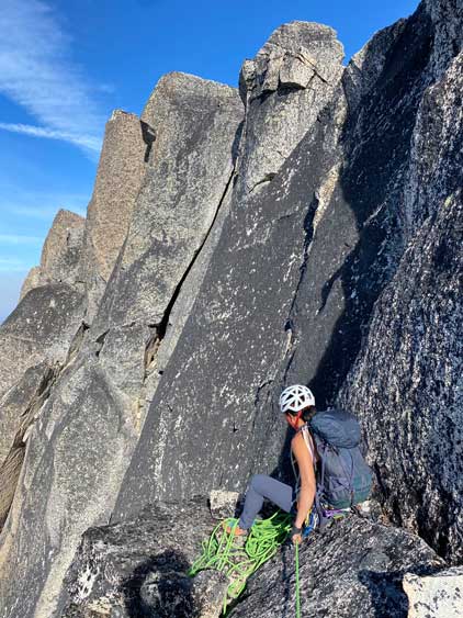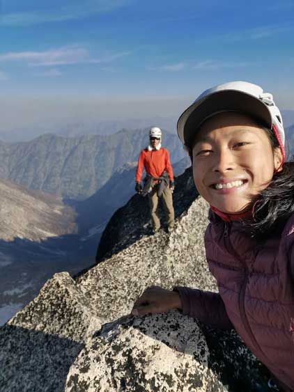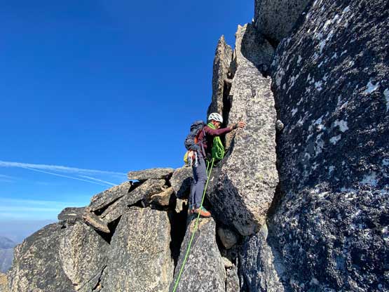 The 5th pitch (leftmost variation) was supposed to be the second hardest pitch so Winnie had to keep leading. It started with some power-layback series and transitioned into a vertical off-width that felt legit for the 5.8+ grade. I did not find this pitch to be as technical as the previous one. After coming up to the belay station I offered to the lead the following two pitches. The 6th pitch was rated 5.6 but involved some extreme exposure and at least one challenging spot that took me a while to figure out the sequence. The 7th pitch “second set of twin cracks” wasn’t very obvious but after searching back and forth we located the cracks on climber’s right side of the crest. I found this pitch (5.7) to be rather enjoyable than stressful that I actually accidently overshot the end of it. I ended up climbing partway up the 8th pitch and realized I was suddenly only meters below the infamous run-out slabs. Thankfully there were enough features for me to build an anchor to belay Winnie up to handle the mental crux ahead. Winnie placed a #4 cam into the widening crack and a few smaller pieces of cams before committing to the 5.8 slab moves. I honestly did not find this pitch hard at all, but I also did not lead it. We then scrambled over the top of Paisano Pinnacle and made some awkward down-climbs into Paisano/Burgundy col. This small summit of Paisano Pinnacle seems too insignificant to be claimed as a separate peak so I did not count it in my numbers. The name of “Paisano Pinnacle” is also unofficial.