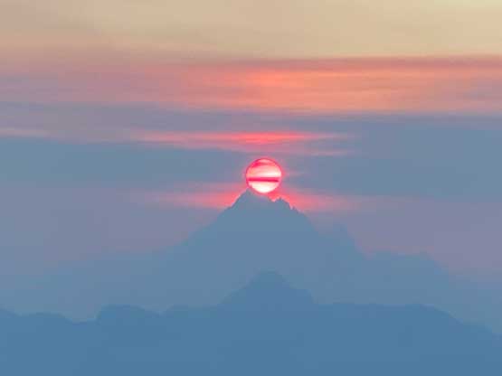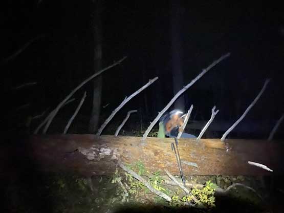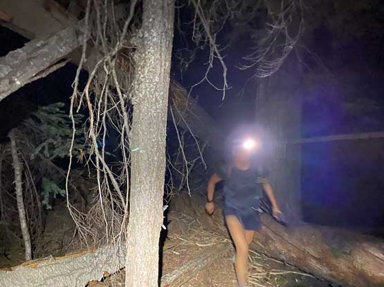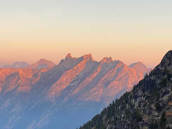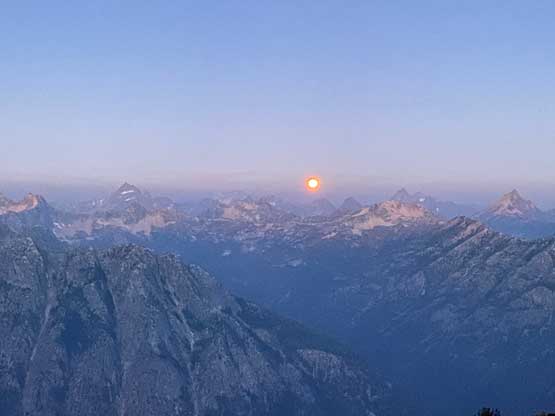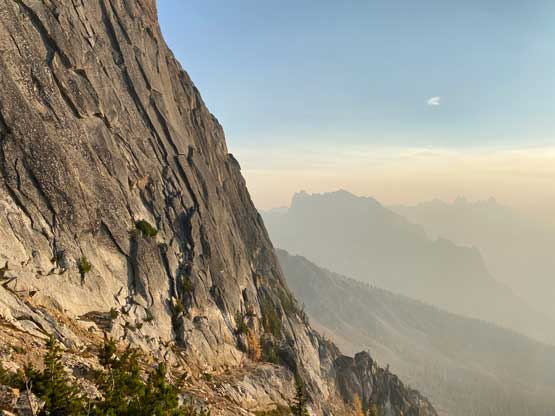 I had read that the rappel wouldn’t be straightforward with significant risks of ropes being stuck and I could see why from the first rappel. There’s one crack that we tried really hard to avoid putting the rope into, but it slid into the crack eventually upon pulling. Thankfully the rope was not stuck into the deep crack. The beta also says the first rappel would be a stretcher using one 60 m rope but we found an intermediate station and broke this rappel into two. The third rappel was the done from that bolted anchor and the 4th rappel got us down onto the key ledge. We coiled the rope and scrambled back across the ledge. Winnie then led three rappels in a series to get us down through the amphitheatre. We picked up the ditched gears, down-scrambled some chossy ledges and did two more rappels to descend into Burgundy Col. This entire descent was rather easy and fluent for us and we did 9 rappels in total to get off the mountain. We then picked up the climber’s trail and descended to our lower stash of gears and it’s here that we finally faced the sunset of this day. The rest of the descent was rather uneventful in the dark, but the smoke had finally blown in and we could smell the fires. I then pushed us back to near Marblemount until I could not drive anymore. I simply parked at a random pullout and crashed on the driver’s seat. We woke up at around 4 am and drove home afterwards.