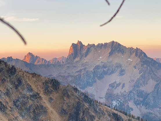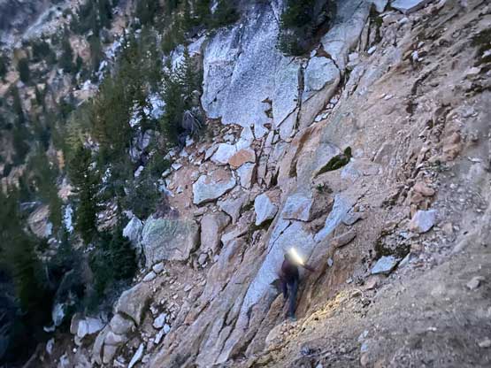 I had previously done this approach in June 2017 for Silver Star Mtn. and we also downloaded multiple sets of GPS tracks so the navigation in the dark wouldn’t be a problem. After the initial confusing descent to cross Early Winters Creek we picked up the climber’s trail. There were more blowdowns than expected that we briefly lost the trail a few times. Thankfully with the GPS technology we quickly regained the route and had no further problem making to the “larch bench”. The grade of this approach wasn’t very steep and the trail quality was mostly fine. The “larch bench” is one flat area where most parties would choose to spend the night at, but as expected there’s no source of water whatsoever. We then ascended the upper parts of this trail into the treeline zone and started to encounter some unpleasant scree and compact type of choss. We ditched a bunch of unnecessary gears including some extra water and headlamps batteries at 2250 m and made a difficult traverse southwards onto the West Ridge of Paisano Pinnacle. It was still mostly in a pitch dark so we really took our time to make sure we wouldn’t be doing the climb still with head-lamps on. I did not think we picked the best route to cover this tedious section of horizontal traverse as we encountered endless micro-terrain with lots of compact type of choss. We lost time here without even noticing.