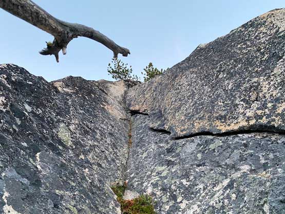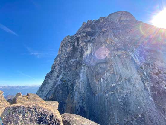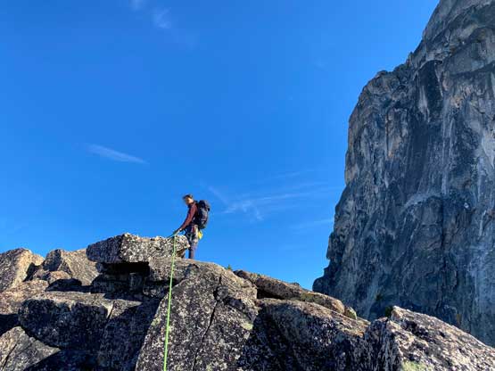 The top of the amphitheatre was a wide ledge which was the key on this route. We would be scrambling down across this ledge for about 60 m to the right (south) before making any upwards climbing. I thought this would be mostly “walking” but it actually involved a few 5th class down-climbs. There’s also a tunnel to walk through which was quite cool. The “far climber’s right option” on the upper route was not very obvious to locate so we again, scrambled up 4th and low 5th class terrain until belaying was needed. I decided to lead the next pitch which was supposed to be the easier of the two upper pitches. The hardest of this pitch was a short crack. The walls on the sides were covered in lichen. The beta says this pitch to be just over 30 m so I belayed Winnie using a gear anchor once the midpoint was passed. In retrospect I should have climbed another 10 m or so and belay from above. Winnie then took the next lead which involved another 5.8 face/slab corner but opted to stop just before the final off-width finish. I came to the belay station and spontaneous decided to take on the responsibility to handle that off-width. I anticipated some scary moments but the climbing actually felt straightforward (more 5.7 than 5.8) and in short time I topped out onto the summit ridge. I belayed Winnie to the summit ridge and we then took turns scrambling the true summit boulder, which involved a few more 5th class moves with exposure. We lingered on the summit for a long time as we were doing great on time.