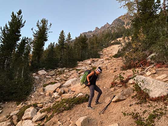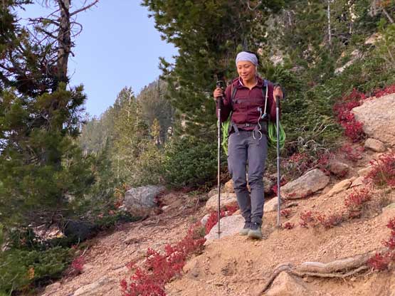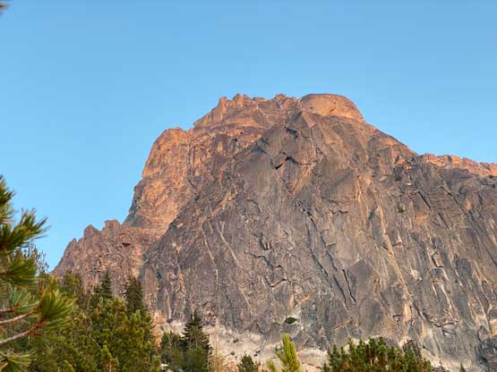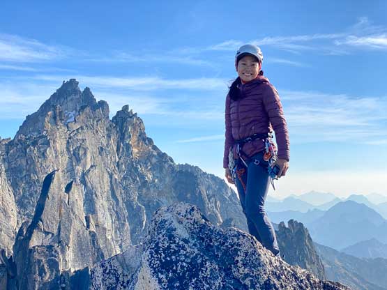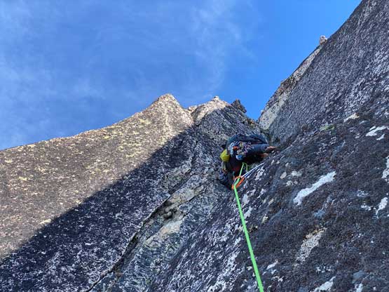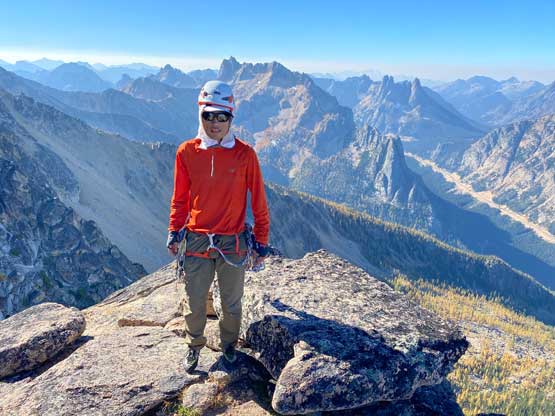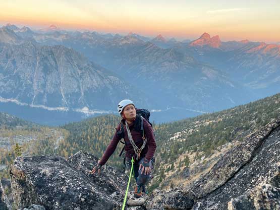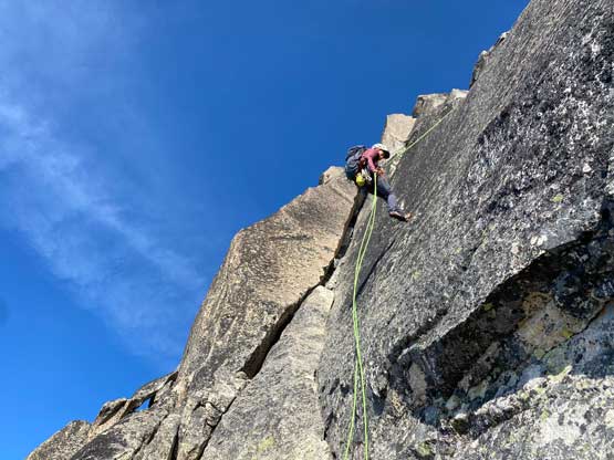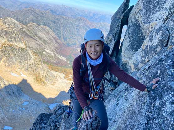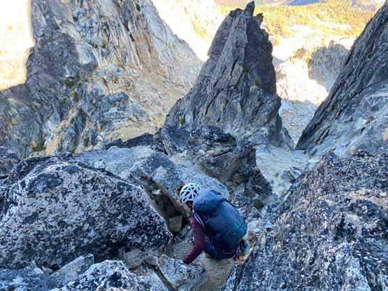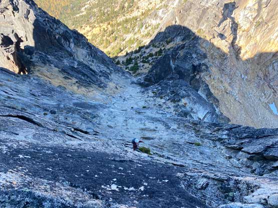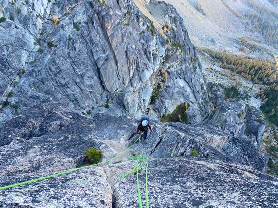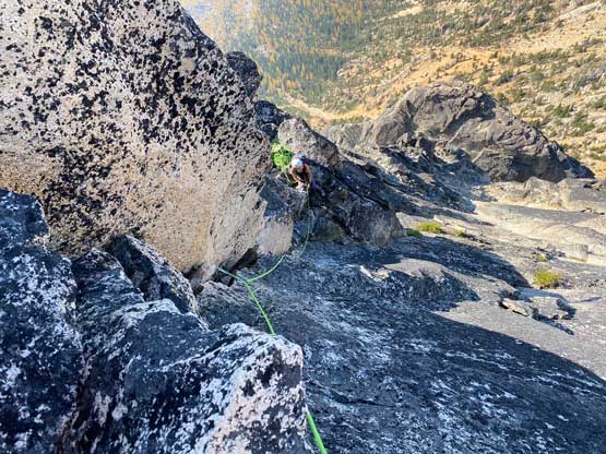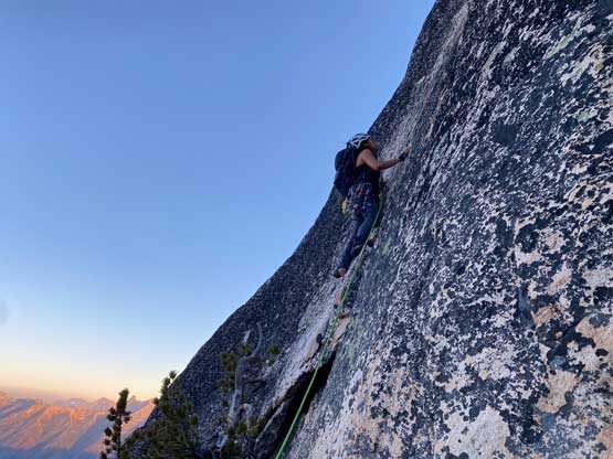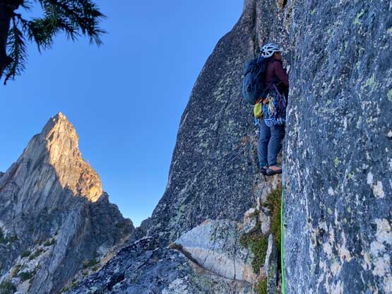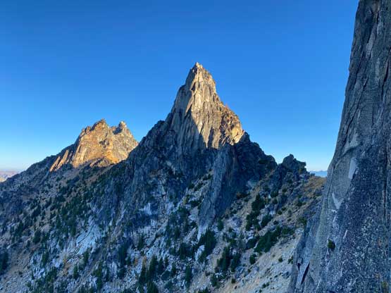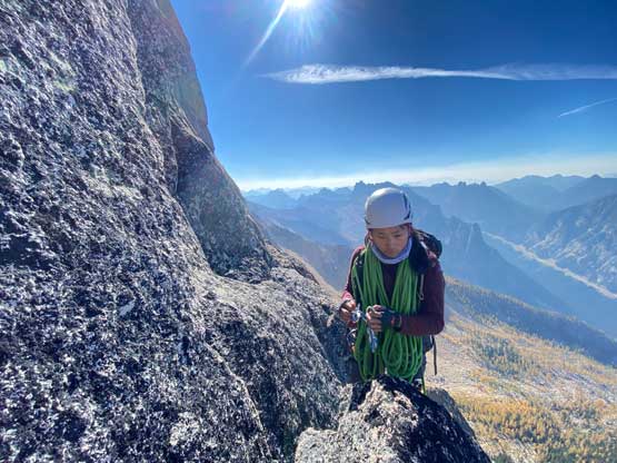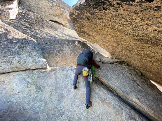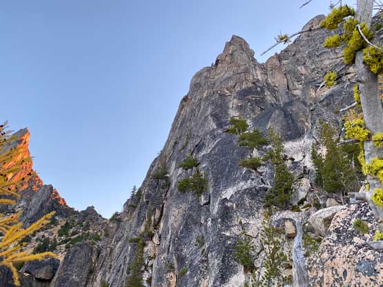 The easiest route on Burgundy Spire goes up from “Burgundy Col” bypassing a smaller tower called the “Paisano Pinnacle” but still involves 6-8 pitches up to 5.8. The more aesthetic and the more commonly used route is the link-up of the west ridge of Paisano Pinnacle to the north face of Burgundy Spire. The climb of Paisano Pinnacle adds another 8 pitches up to 5.8+/5.9- while bypassing the first two (easier) pitches on Burgundy Spire. The harder pitches on Burgundy Spire still have to be climbed making a total of 12+ pitches of climbing at a sustained grade of 5.7-5.8. The physical crux of the whole route is the 4th pitch “twin cracks” on Paisano Pinnacle whereas the mental crux is generally considered to be the run-out slab on the 8th pitch of Paisano Pinnacle. The upper route on Burgundy Spire however has a much greater deal of mountaineering nature with complicated route-finding and loose rocks making this a full-on commitment. Winnie and I decided to climb this Pasiano-Burgundy link-up taking advantage of the abnormally sunny and warm weather in this fall season but I have to say I was quite nervous about it. I had never climbed 12 pitches of such grade in one day (not even at the crags) so this trip would push me beyond my comfort zone into the unknowns. I didn’t know if my upper body’s endurance would be up for such a challenge. This would also be at the tailing end of an intense week of alpine climbing. On the first trip I did a 21-hour single push into Buckner group including making a first ascent of the west face of Lick of Flame, and on the second trip I did a 2-day ascent of Johannesburg Mtn. I was both mentally and physically drained at this point but this was supposed to be a week of challenge so I must press on.