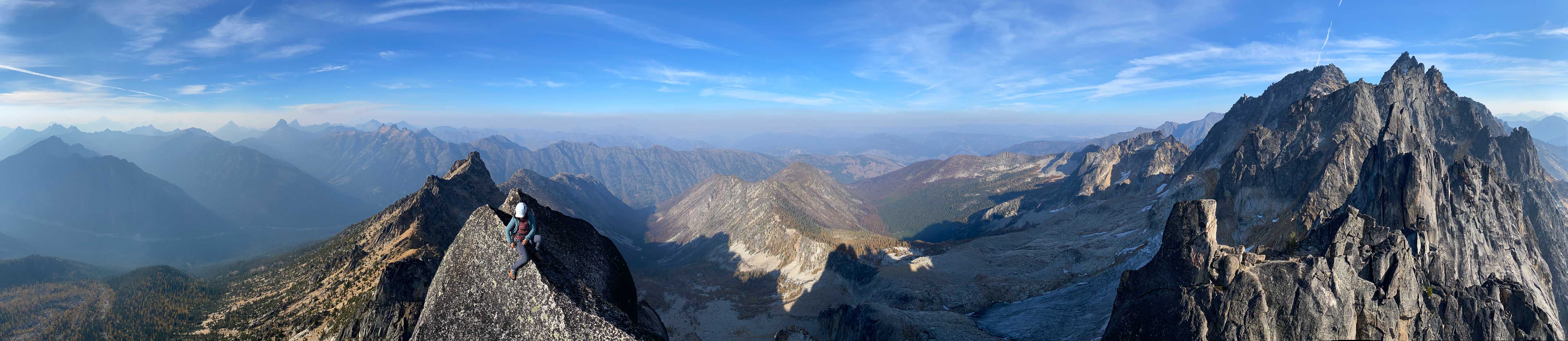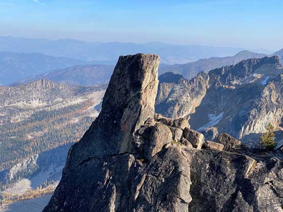 “Burgundy Spire” is one of the 4 major towers in the group of peaks called the “Wine Spires”. These spires aren’t forming a stand-alone massif but are rather attached to the much-bigger Silver Star Mountain. The prominences of these spires are all well under 100 m but all of them require extensive amount of technical climbing. In fact, the “Wine Spires” are considerably harder than the more fabled Liberty Bell Group speaking of their respective easiest routes. “Burgundy Spire” isn’t the tallest in this group but is definitely the most popular as the route is well documented on the internet. This peak is also included in Dallas Kloke’s “Washington Difficult Ten” and is the only one in that list that does not have a heinous approach. The difficulty of this peak comes purely from the rock climbing challenges.