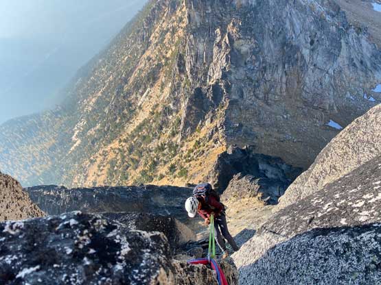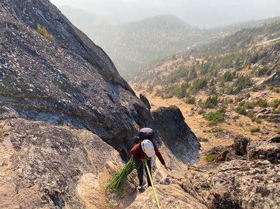 The easiest route on Burgundy Spire goes up from “Burgundy Col” bypassing a smaller tower called the “Paisano Pinnacle” but still involves 6-8 pitches up to 5.8. The more aesthetic and the more commonly used route is the link-up of the west ridge of Paisano Pinnacle to the north face of Burgundy Spire. The climb of Paisano Pinnacle adds another 8 pitches up to 5.8+/5.9- while bypassing the first two (easier) pitches on Burgundy Spire. The harder pitches on Burgundy Spire still have to be climbed making a total of 12+ pitches of climbing at a sustained grade of 5.7-5.8. The physical crux of the whole route is the 4th pitch “twin cracks” on Paisano Pinnacle whereas the mental crux is generally considered to be the run-out slab on the 8th pitch of Paisano Pinnacle. The upper route on Burgundy Spire however has a much greater deal of mountaineering nature with complicated route-finding and loose rocks making this a full-on commitment. Winnie and I decided to climb this Pasiano-Burgundy link-up taking advantage of the abnormally sunny and warm weather in this fall season but I have to say I was quite nervous about it. I had never climbed 12 pitches of such grade in one day (not even at the crags) so this trip would push me beyond my comfort zone into the unknowns. I didn’t know if my upper body’s endurance would be up for such a challenge. This would also be at the tailing end of an intense week of alpine climbing. On the first trip I did a 21-hour single push into Buckner group including making a first ascent of the west face of Lick of Flame, and on the second trip I did a 2-day ascent of Johannesburg Mtn. I was both mentally and physically drained at this point but this was supposed to be a week of challenge so I must press on.