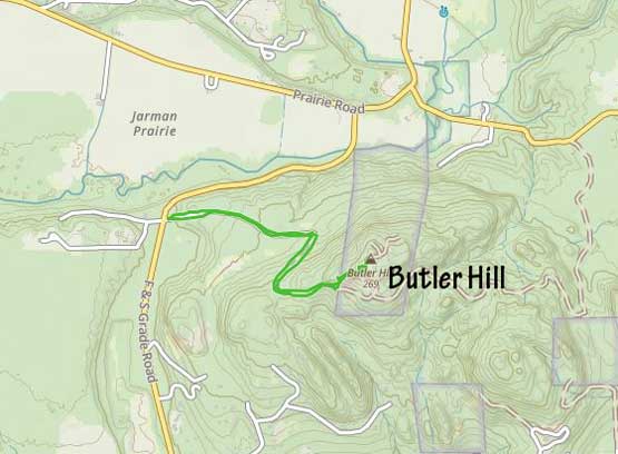 Butler Hill is one of the lowly objectives in the vicinity of Burlington but this one actually offers some interesting views and problem solving. I noticed this hill a few weeks ago and decided to wait until I got my fatbike back from Matt’s shop. It turned out that I went for Butler Hill the next day immediately after I brought the bike back. The weather was fantastic so I went out anyway even though I slept in till 10 am and needed to be back home by 5 pm for work. Thankfully the first hour of work (3:30-4:30 pm) got cancelled as otherwise I wouldn’t be able to squeeze this outing in.