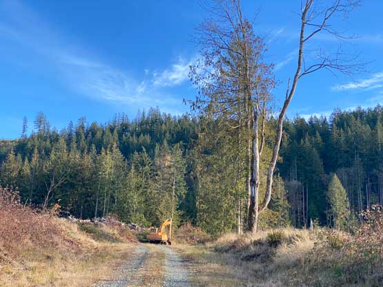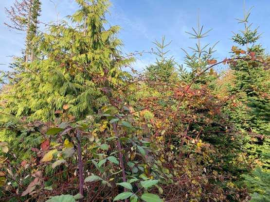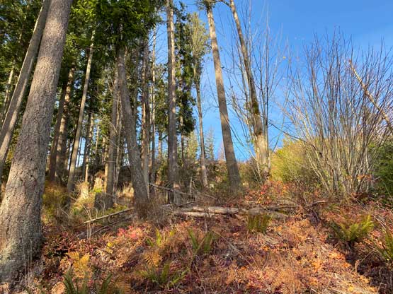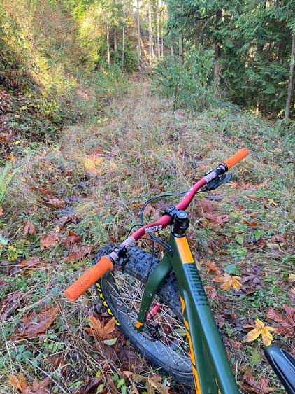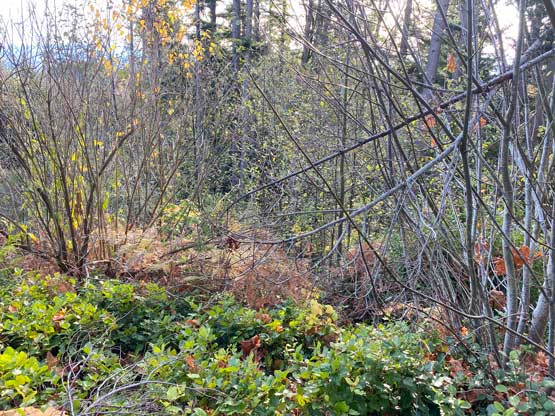 The road portion is under 2 km so biking wasn’t strictly needed but I liked the added fun. This also gave me at least half an hour’s contingency to definitely get back home for work. I managed to pedal all the way to the end of the maintained road and even pushed the bike over a short stretch of overgrown road. I had read Fletcher’s trip report in which he describes “bad bushwhacking” and that’s also the reason why I initially picked the less intuitive eastern access, but now I had to face the same problem as he did. The road quickly became impassibly bushy even for foot travel, so I ditched the bike and dived into the secondary growth forest, hoping the bushwhacking wouldn’t be that bad.