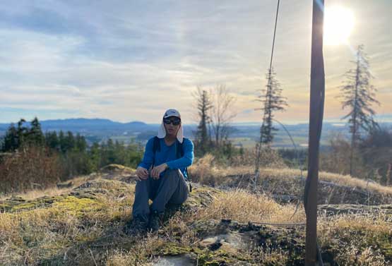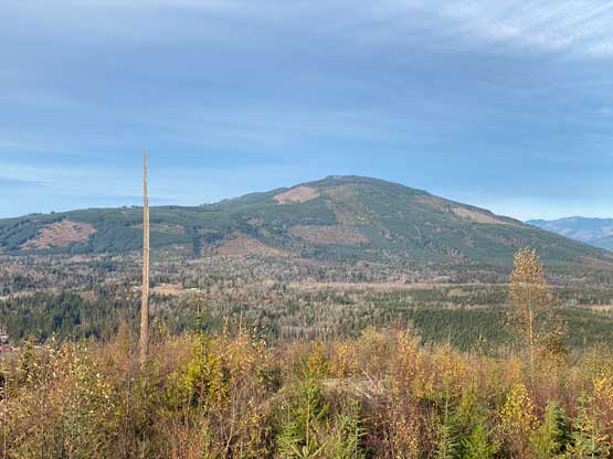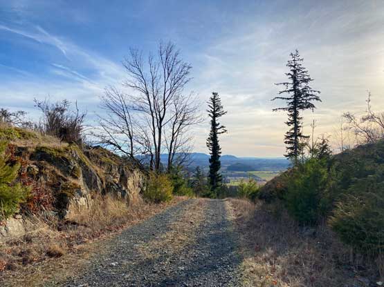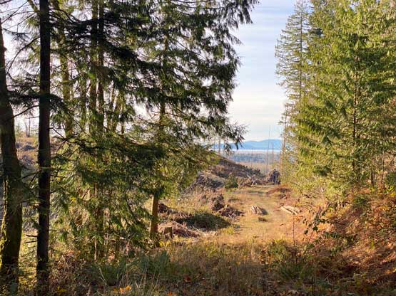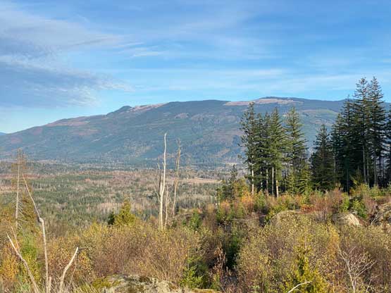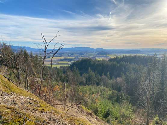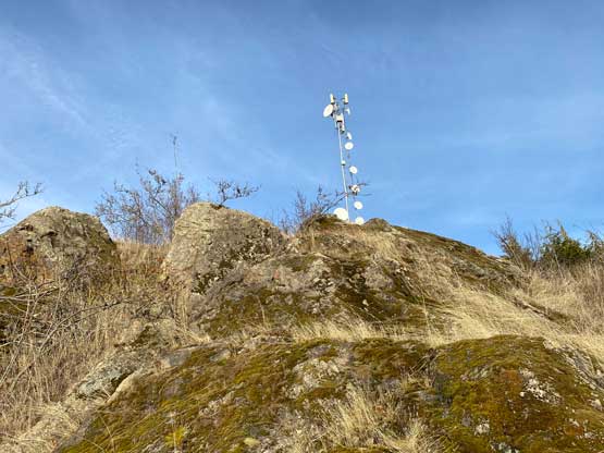 The hope for pleasant-ish forested travel quickly turned into hopelessness. The bush was actually not too dense, but contained a significant deal of prickly plants. Not bringing the trekking poles started to become a mistake as it’s much harder to avoid touching the brambles without the poles to help balancing. I also encountered a series of short steps of scrambles including two stretches of legit 3rd class. Eventually I did top out onto the false summit where the view was actually better. Unfortunately I’m a peak-bagger so traversing to the less interesting true summit was obligated. More thrashing followed and thankfully I managed to descend onto a bush-free logging road (that comes up from that private side). To get onto the very top I still had to leave this road for a short ramble and the view was largely obscured by the communication towers.