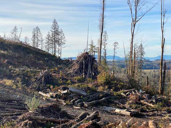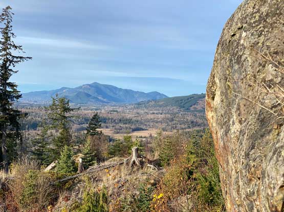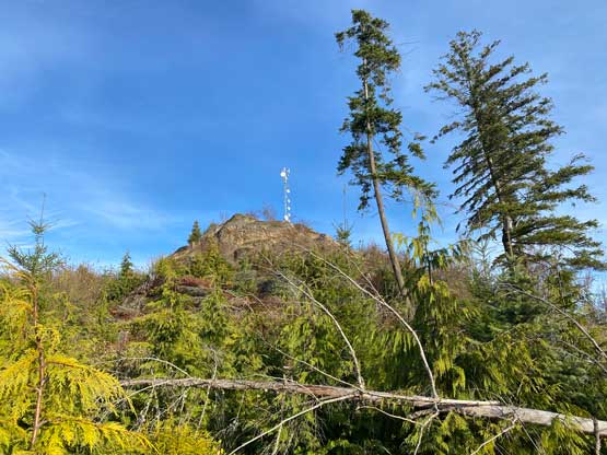 The hope for pleasant-ish forested travel quickly turned into hopelessness. The bush was actually not too dense, but contained a significant deal of prickly plants. Not bringing the trekking poles started to become a mistake as it’s much harder to avoid touching the brambles without the poles to help balancing. I also encountered a series of short steps of scrambles including two stretches of legit 3rd class. Eventually I did top out onto the false summit where the view was actually better. Unfortunately I’m a peak-bagger so traversing to the less interesting true summit was obligated. More thrashing followed and thankfully I managed to descend onto a bush-free logging road (that comes up from that private side). To get onto the very top I still had to leave this road for a short ramble and the view was largely obscured by the communication towers.