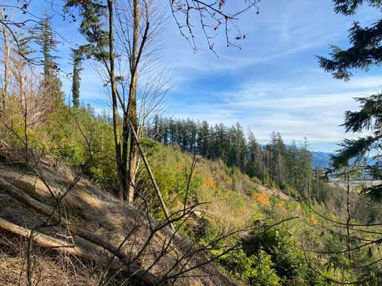 The road portion is under 2 km so biking wasn’t strictly needed but I liked the added fun. This also gave me at least half an hour’s contingency to definitely get back home for work. I managed to pedal all the way to the end of the maintained road and even pushed the bike over a short stretch of overgrown road. I had read Fletcher’s trip report in which he describes “bad bushwhacking” and that’s also the reason why I initially picked the less intuitive eastern access, but now I had to face the same problem as he did. The road quickly became impassibly bushy even for foot travel, so I ditched the bike and dived into the secondary growth forest, hoping the bushwhacking wouldn’t be that bad.