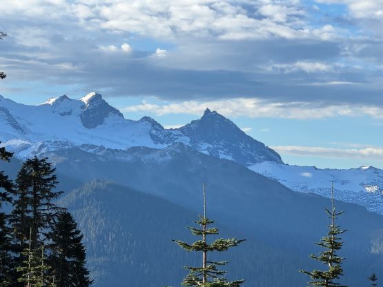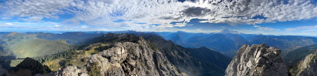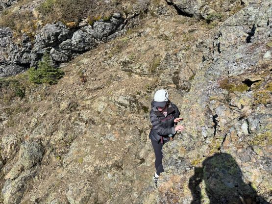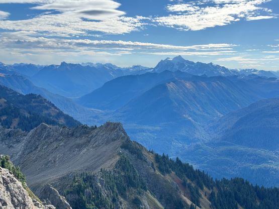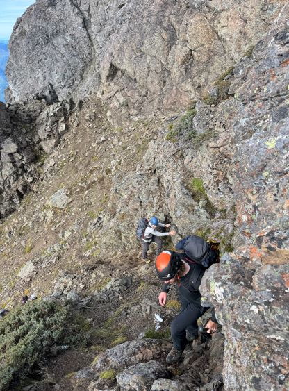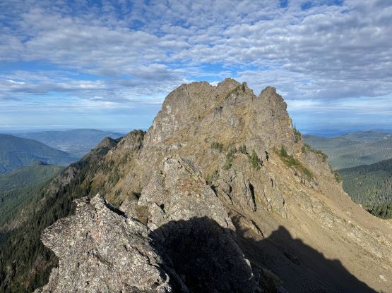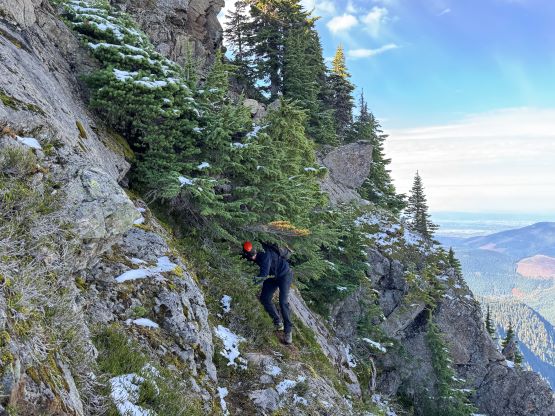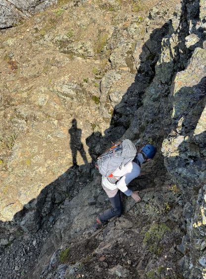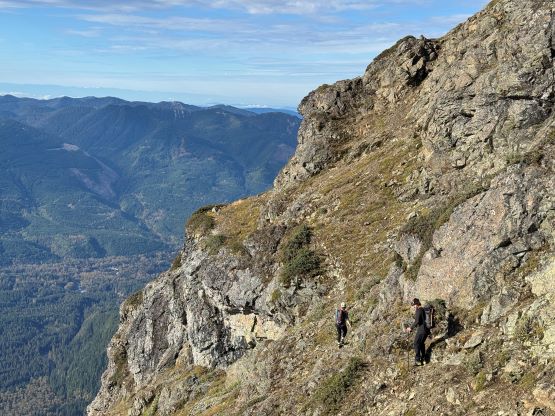 After traversing back into the sunshine we took another break mostly for me to swap footwear from the trail-runners to the Trango Tech mountaineering boots. I had opted to wear the Salomon runners on this outing and they weren’t nearly as good as the Arc’teryx approach shoes especially on wet and greasy terrain. We then traversed into and out of a couple gullies with one involving a few committing 3rd class moves, a long ways across the south face to that diagonal “ramp” trending NE. Ascending this ramp all the way to the east ridge, east of the false summit was the easiest part of the route but there were lots of loose pebbles on down-sloping terrain that warranted caution. I knew some parties took the route up and over the false summit but we opted for simplicity, traversing down onto the narrow path on the north side. There was unfortunately still some snow but not a lot. This entire traverse on the north side of the ridge was wet and greasy but no gear was needed. We had to thrash through some bushes, climb some steep heather and deal with at least one more exposed class 3 section but the true summit was quickly attained.